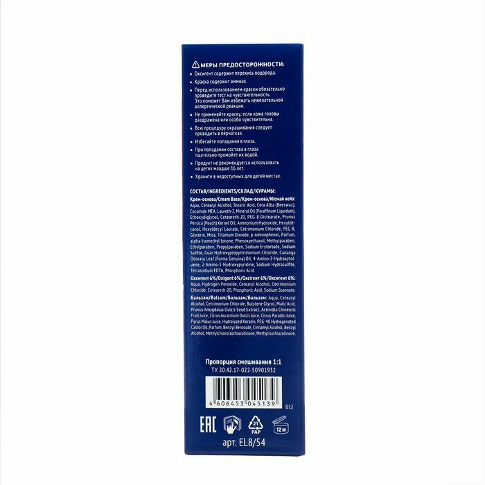| Дополнительная информация | тест на чувствительности: приготовьте смесь из небольшого количества крем-основы и такого же объёма оксигента, перемешав их в любой неметаллической посуде. Не следует готовить весь объем краски. Нанесите приготовленную смесь на небольшой участок кожи на внутренней стороне локтевого сгиба или за ухом и оставьте на 10-15 минут. Затем смойте. Если в течение суток признаки аллергической реакции не появились, можете использовать краску |
