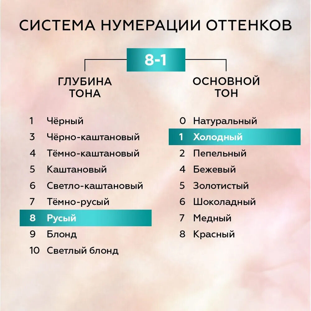 | Дополнительная информация | тюбик с окрашивающим кремом - 60 мл, флакон-аппликатор с проявляющей эмульсией - 60 мл, ухаживающая маска для волос - 22,5 мл |