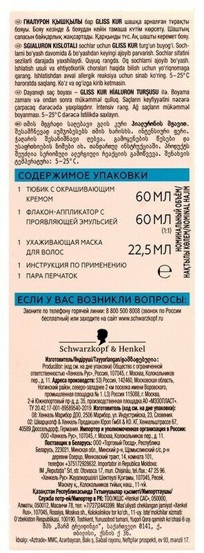 | Комплектация | 1 тюбик с окрашивающим кремом 60 мл, 1 флакон-аппликатор с проявляющей эмульсией 60 мл, 1 ухаживающая маска для волос 22,5 мл, 1 инструкция по применению, 1 пара перчаток |