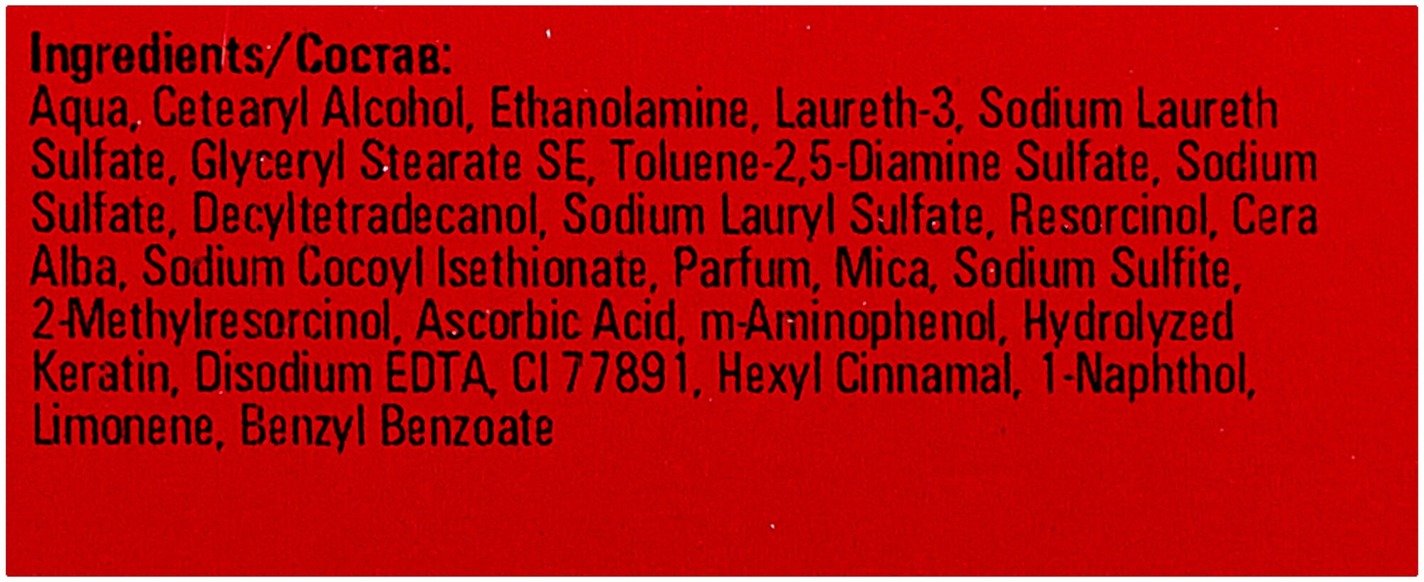 | Состав | aqua, cetearyl alcohol, ethanolamine, laureth-3, sodium laureth sulfate, glyceryl stearate se, toluene-2,5 diamine sulfate, sodium sulfate, decyltetradecanol, sodium lauryl sulfate, cera alba, parfum, sodium cocoyl isethionate, mica, hydroxyethyl-3,4-methylenedioxyaniline hci,resorcinol, sodium sulfate, m-aminophenol, ascorbic acid, hydrolyzed keratin, disidium edta, 2-methylresorcinol, ci 77891, hexyl cinnamal, limonene, benzyl benzoate, citric acid |