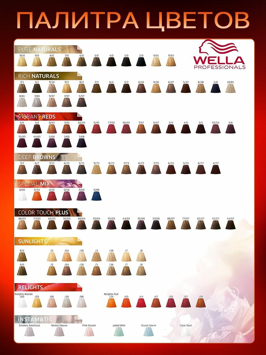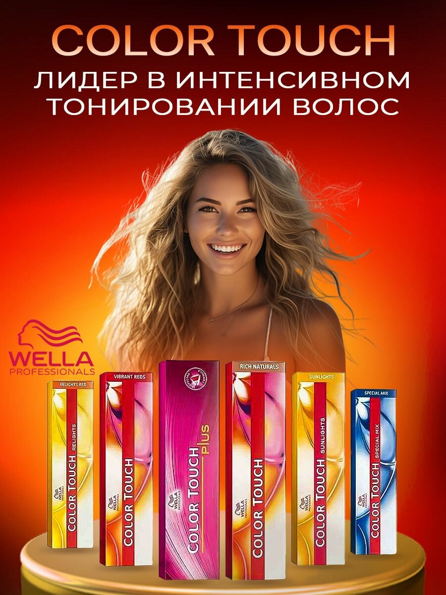 | Способ применения | нанесите смесь Color Touch на вымытые и подсушенные полотенцем волосы, равномерно от корней до кончиков; Время выдержки с теплом 15 минут, без тепла 20 минут; По истечении времени тщательно смойте остатки краски водой, применяя шампунь Wella для окрашенных волос |