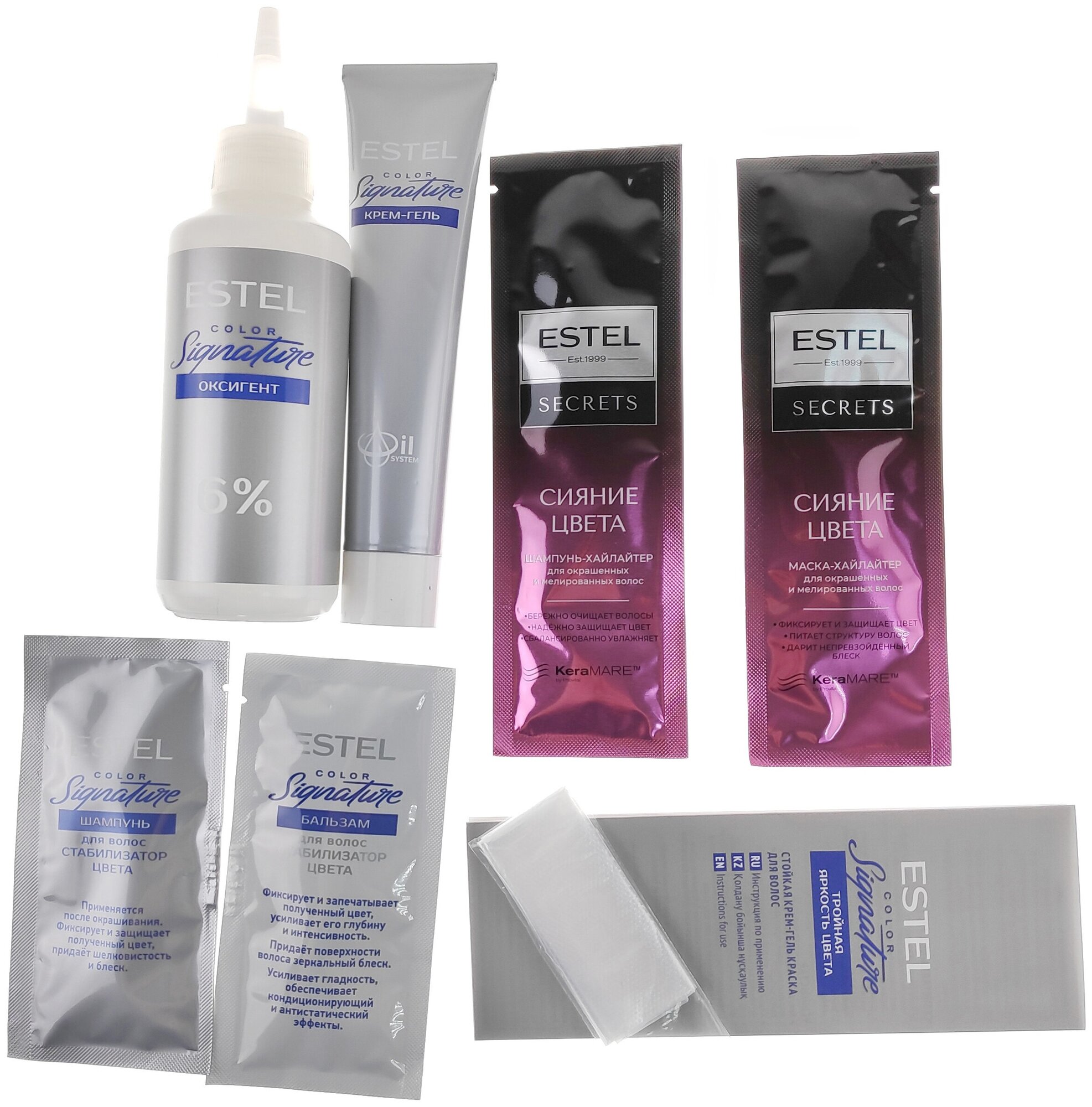 | Комплектация | крем-гель,оксигент,Шампунь для волос "Стабилизотор цвета" ESTEL COLOR Signature,Бальзам для волос «Стабилизатор цвета» ESTEL COLOR Signature,Шампунь-хайлайтер для окрашенных и мелированных волос «СИЯНИЕ ЦВЕТА»,Маска-хайлайтер для окрашенных и мелированных волос «СИЯНИЕ ЦВЕТА» ESTEL SECRETS, перчатки, инструкция |