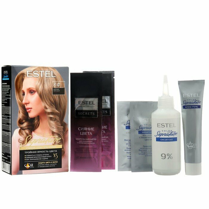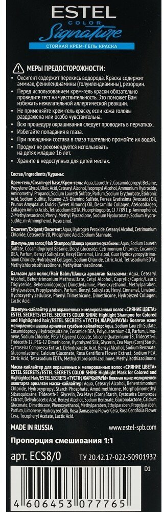 | Комплектация | крем-гель,оксигент,Шампунь для волос "Стабилизотор цвета" ESTEL COLOR Signature,Бальзам для волос «Стабилизатор цвета» ESTEL COLOR Signature,Шампунь-хайлайтер для окрашенных и мелированных волос «СИЯНИЕ ЦВЕТА»,Маска-хайлайтер для окрашенных и мелированных волос «СИЯНИЕ ЦВЕТА» ESTEL SECRETS, перчатки, инструкция |