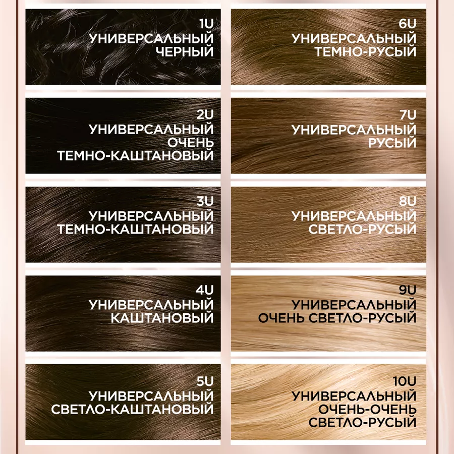 | Цвет товара | 10U универсальный очень-очень светло-русый, 1U универсальный черный, 2U универсальный очень тёмно-каштановый, 3U универсальный темно-каштановый, 4U универсальный каштановый, 5U универсальный светло-каштановый, 6U темно-русый, 7U универсальный русый, 8U универсальный светло-русый, 9U универсальный очень светло-русый |