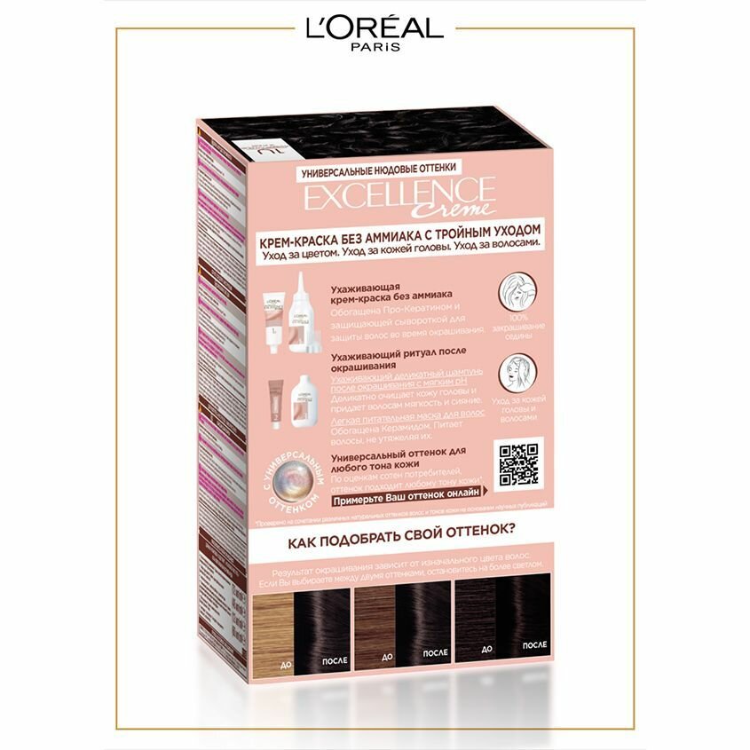 Крем-краска для волос L'oreal Excellence Creme Nudes, тон: 3U Универсальный темно-каштановый, 192 мл