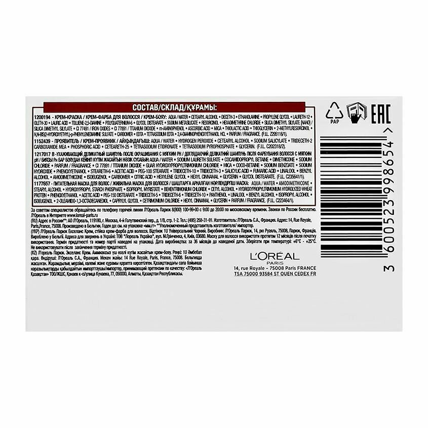 L'OREAL Крем-краска без аммиака с тройным уходом Excellence Creme, 268 г, 6U темно-русый