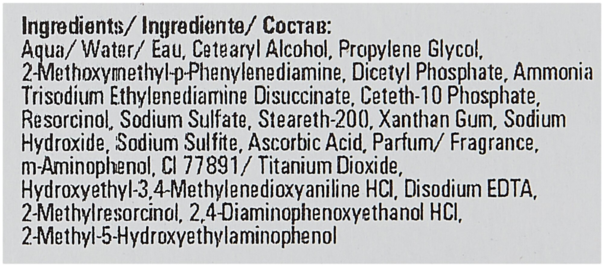 | Состав | aqua, cetearyl alcohol, glyceryl stearate se, ammonium hydroxide, sodium laureth sulfate, glycol distrearate, lanolin alcohol, 2-methoxymethyl-p-phenylenediamine, sodium lauryl sulfate, resorcinol, sodium sulfate, sodium cocyl isethioate, sodium sulfite, ascorbic acid, m-aminophenol, parfum, hydroxyethyl-3, 4-methylenedioxyaniline hci, disodium edta, 2-methylresorcinol, tocopherol |