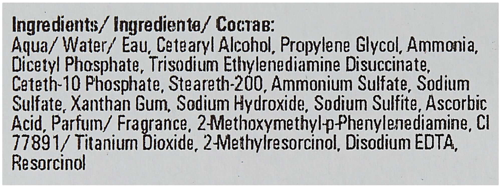 | Состав | aqua, cetearyl alcohol, glyceryl stearate se, ammonium hydroxide, sodium laureth sulfate, glycol distrearate, lanolin alcohol, 2-methoxymethyl-p-phenylenediamine, sodium lauryl sulfate, resorcinol, sodium sulfate, sodium cocyl isethioate, sodium sulfite, ascorbic acid, m-aminophenol, parfum, hydroxyethyl-3, 4-methylenedioxyaniline hci, disodium edta, 2-methylresorcinol, tocopherol |