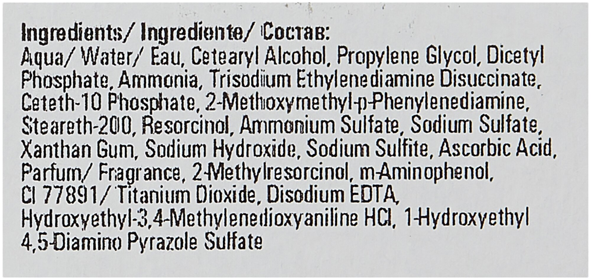| Состав | aqua, cetearyl alcohol, glyceryl stearate se, ammonium hydroxide, sodium laureth sulfate, glycol distrearate, lanolin alcohol, 2-methoxymethyl-p-phenylenediamine, sodium lauryl sulfate, resorcinol, sodium sulfate, sodium cocyl isethioate, sodium sulfite, ascorbic acid, m-aminophenol, parfum, hydroxyethyl-3, 4-methylenedioxyaniline hci, disodium edta, 2-methylresorcinol, tocopherol |