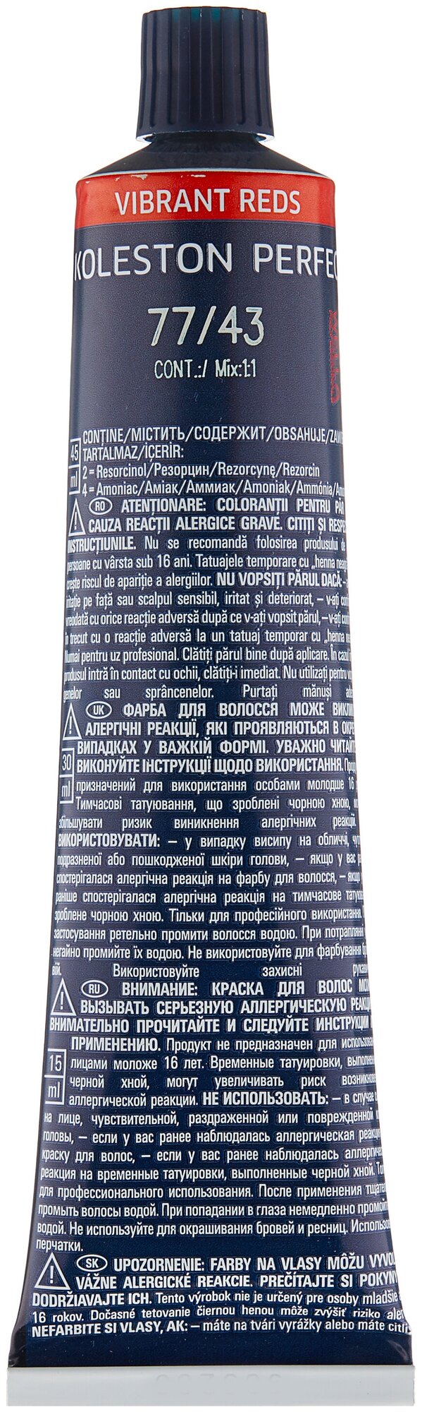 | Способ применения | смешайте краску с окислителем Welloxon Perfect в пропорции 1:1. Равномерно нанесите полученную смесь на чистые, влажные волосы по всей длине, уделяя особое внимание корням волос и кончикам. Оставьте для воздействия на 30-40 минут без тепла, 15-25 минут с теплом. Смойте остатки краски водой |