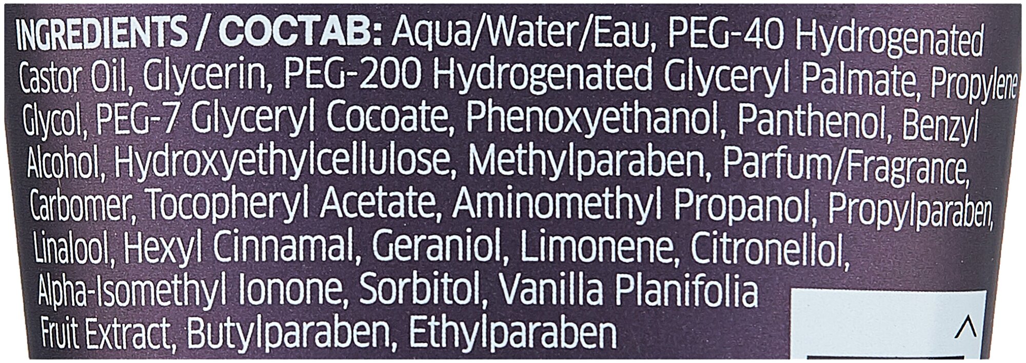 | Состав | aqua, peg-40 hydrogenated castor oil, glycerin, peg-200 hydrogenated glyceryl palmate, propylene glycol, peg-7 glyceryl cocoate, phenoxyethanol, panthenol, hydroxyethylcellulose, benzyl alcohol, methylparaben, parfum, tocopheryl acetate, carbomer, aminomethyl propanol, propylparaben, linalool, hexyl cinnamal, geraniol, limonene, citronellol, butylphenyl methylpropional, alpha-isomethyl ionone, sorbitol, vanilla planifolia fruit extract, ethylparaben, butylparaben |