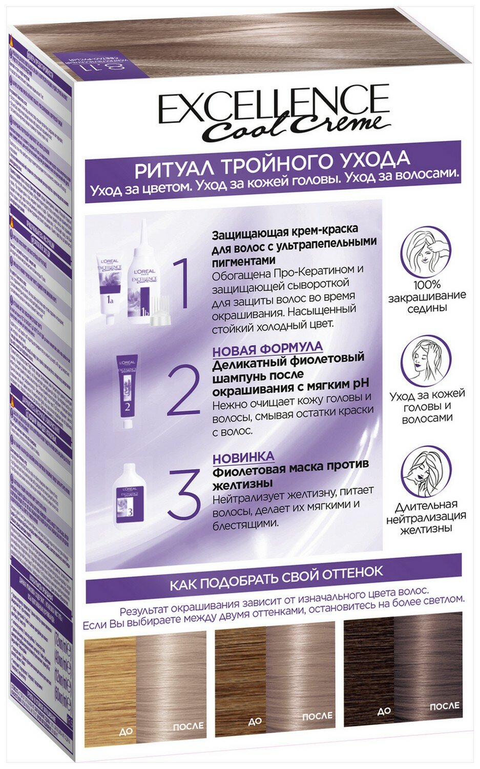 СохранитьL'OREAL Крем-краска для волос Excellence Cool Crème стойкая, 8.11, Ультрапепельный, Светло-Русый интересное: