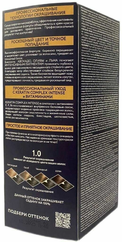 | Дополнительная информация | краситель – 50 мл, окислитель – 50 мл, бальзам – 15 мл Перед применением проведите тест на аллергическую реакцию. Не обязательно мыть волосы перед окрашиванием. Рекомендуется выдержать 2 недели до и после химической завивки. Не рекомендуется использовать краску на волосах, окрашенных хной. |