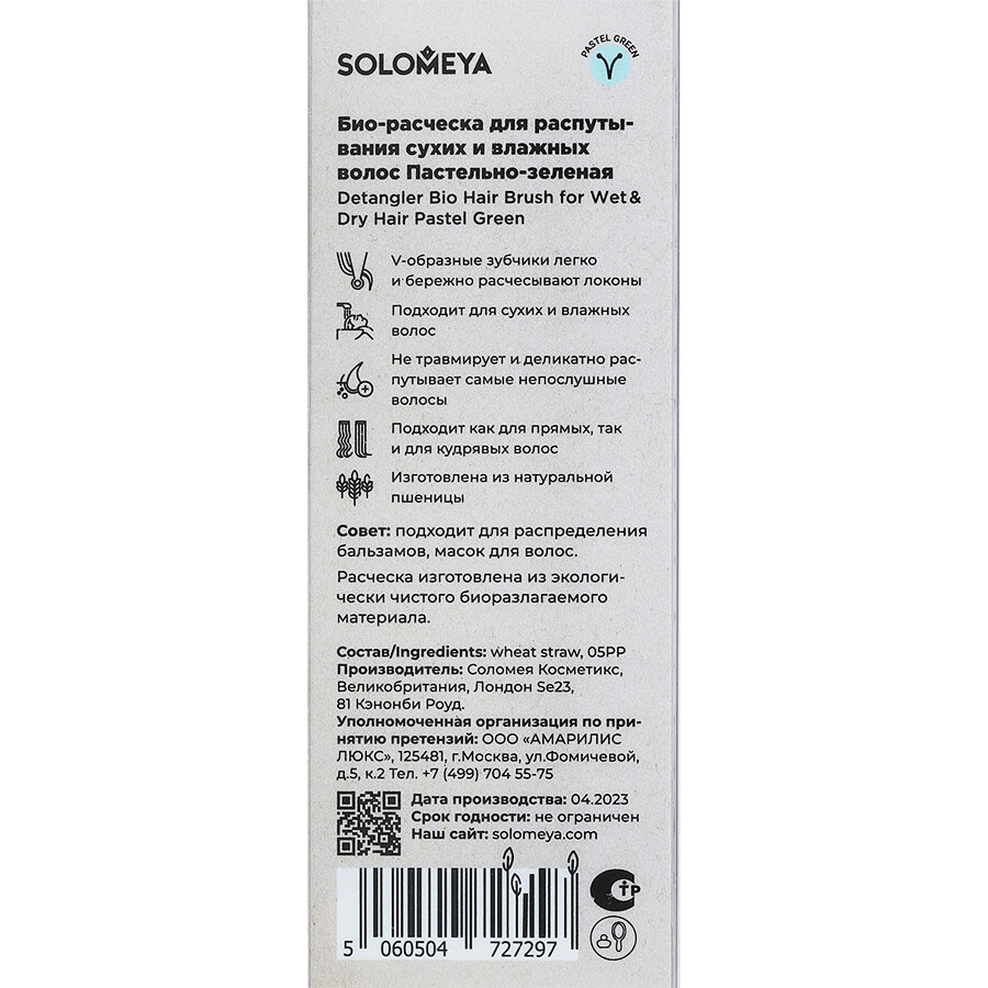Solomeya Био-расческа для распутывания сухих и влажных волос Пастельно-зеленая