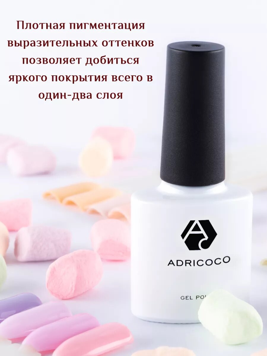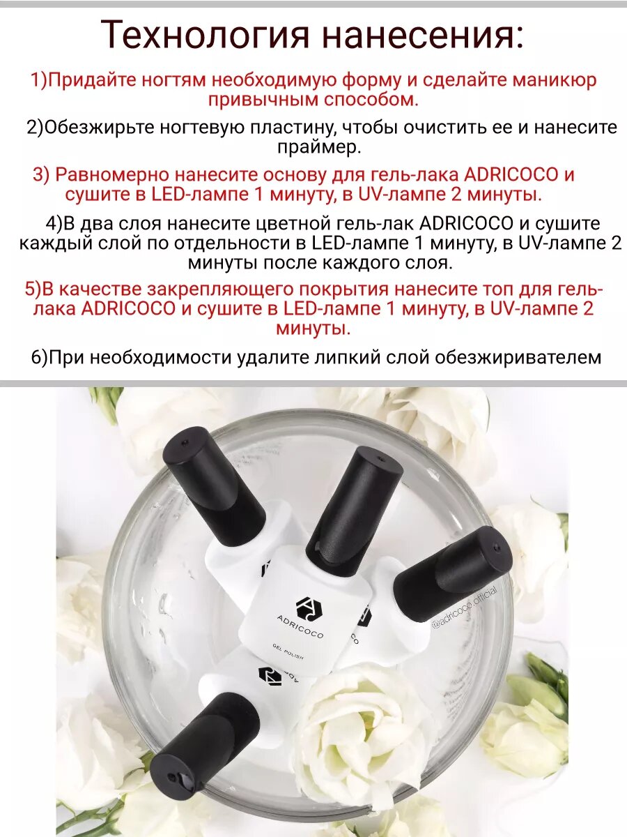 | Способ применения | 1)Придайте ногтям необходимую форму и сделайте маникюр привычным способом. 2)Обезжирьте ногтевую пластину, чтобы очистить ее и нанесите праймер. 3) Равномерно нанесите основу для гель-лака ADRICOCO и сушите в LED-лампе 1 минуту, в UV-лампе 2 минуты. 4)В два слоя нанесите цветной гель-лак ADRICOCO и сушите каждый слой по отдельности в LED-лампе 1 минуту, в UV-лампе 2 минуты после каждого слоя. 5)В качестве закрепляющего покрытия нанесите топ для гель-лака ADRICOCO и сушите в LED-лампе 1 минуту, в UV-лампе 2 минуты. 6)При необходимости удалите липкий слой обезжиривателем. |