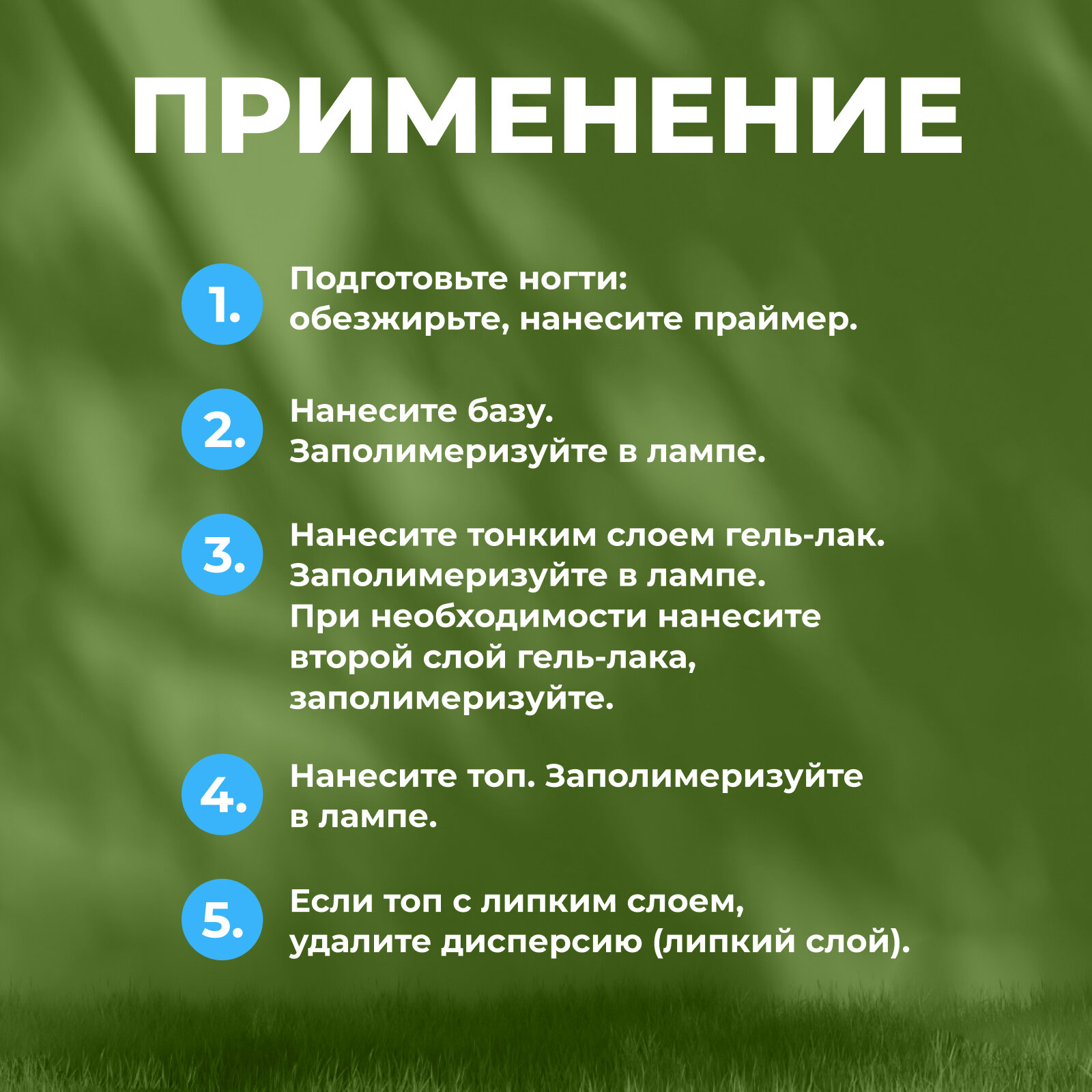 | Способ применения | подготовьте ногти: снимите глянец мягким бафом, обезжирьте, нанесите праймер. Нанесите базу, полимеризуйте в LED-лампе 60 секунд, в UV-лампе – 2 минуты. Нанесите тонким слоем гель-лак, полимеризуйте в LED-лампе 60 секунд, в UV-лампе – 2 минуты. При необходимости нанесите второй слой гель-лака, полимеризуйте так же. Нанесите топ, полимеризуйте в LED-лампе 60 секунд, в UV-лампе – 2 минуты. Если топ с липким слоем, удалите дисперсию |