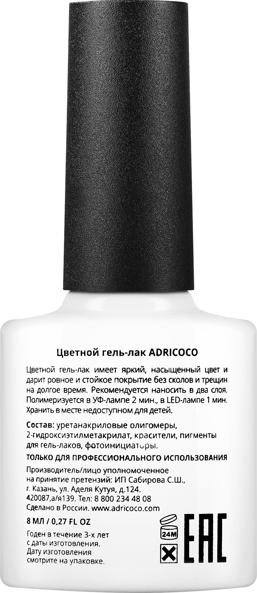 | Способ применения | обезжирьте ногтевую пластину, чтобы очистить ее и нанесите праймер. Равномерно нанесите основу для гель-лака ADRI COCO и сушите в LED-лампе 1 минуту, в UV-лампе 2 минуты. В два слоя нанесите цветной гель-лак ADRI COCO и сушите каждый слой по отдельности в LED-лампе 1 минуту, в UV-лампе 2 минуты после каждого слоя. В качестве закрепляющего покрытия нанесите топ для гель-лака ADRI COCO и сушите в LED-лампе 1 минуту, в UV-лампе 2 минуты. При необходимости удалите липкий слой обезжиривателем. В качестве дополнительного ухода используйте масло для кутикулы |