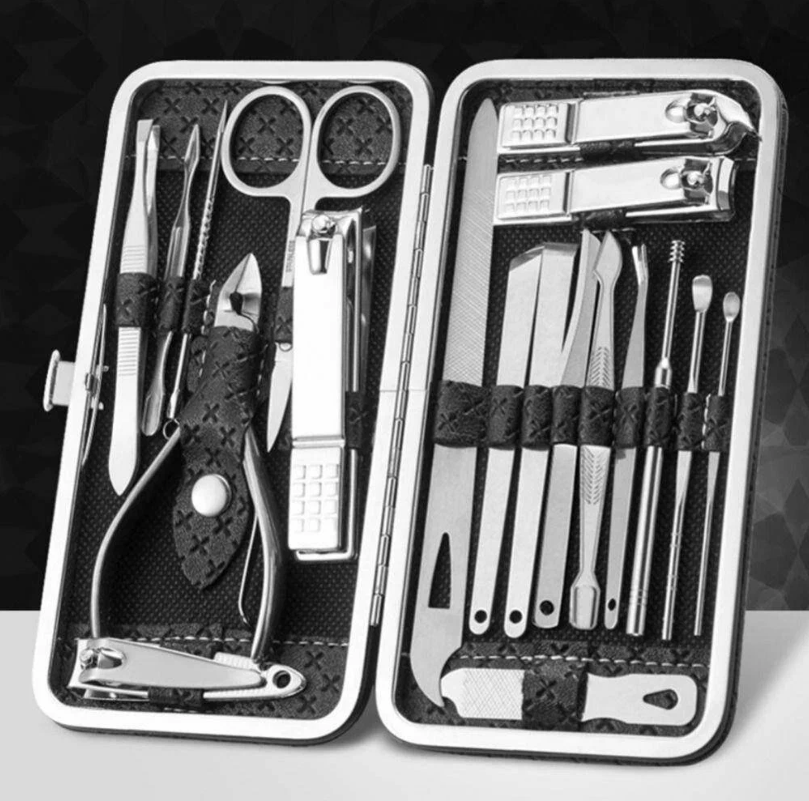 | Состав набора | апельсиновая палочка, книпсер, косметическая петля, кусачки, кусачки для кутикулы, кусачки для маникюра, кусачки для педикюра, лезвия, ножницы, ножницы для кутикулы, ножницы для ногтей, ножницы для педикюра, пилка, пилка педикюрная, пинцет, пушер для кутикулы, разделитель для пальцев, скребок |