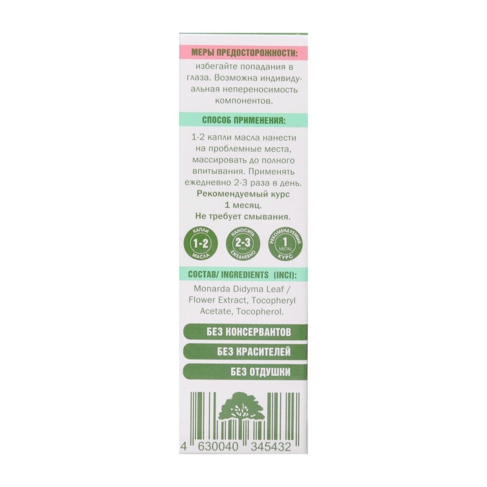 | Способ применения | 1-2 капли масла нанести на проблемные места, массировать до полного впитывания. Применять ежедневно 2-3 раза в день. Курс 1 месяц. Не требует смывания. |