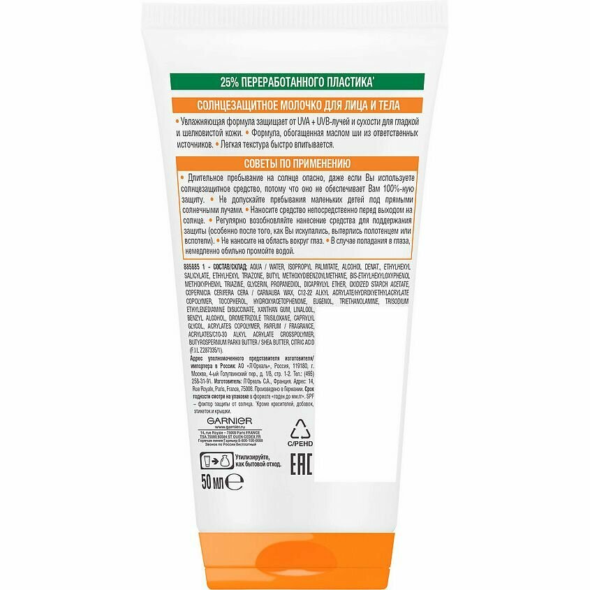 Garnier Солнцезащитное молочко для лица и тела Ambre Solaire, SPF 50+, водостойкое, нежирное, с маслом ши, 50 мл. интересное: