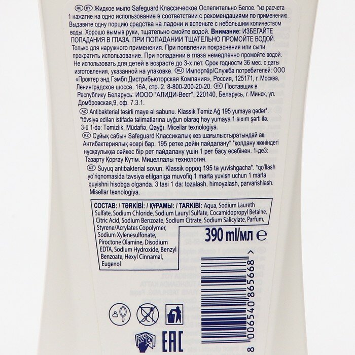 Купить Жидкое мыло Safeguard Классическое Ослепительно Белое с антибактериальным эффектом, 390 мл