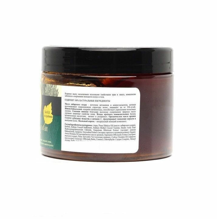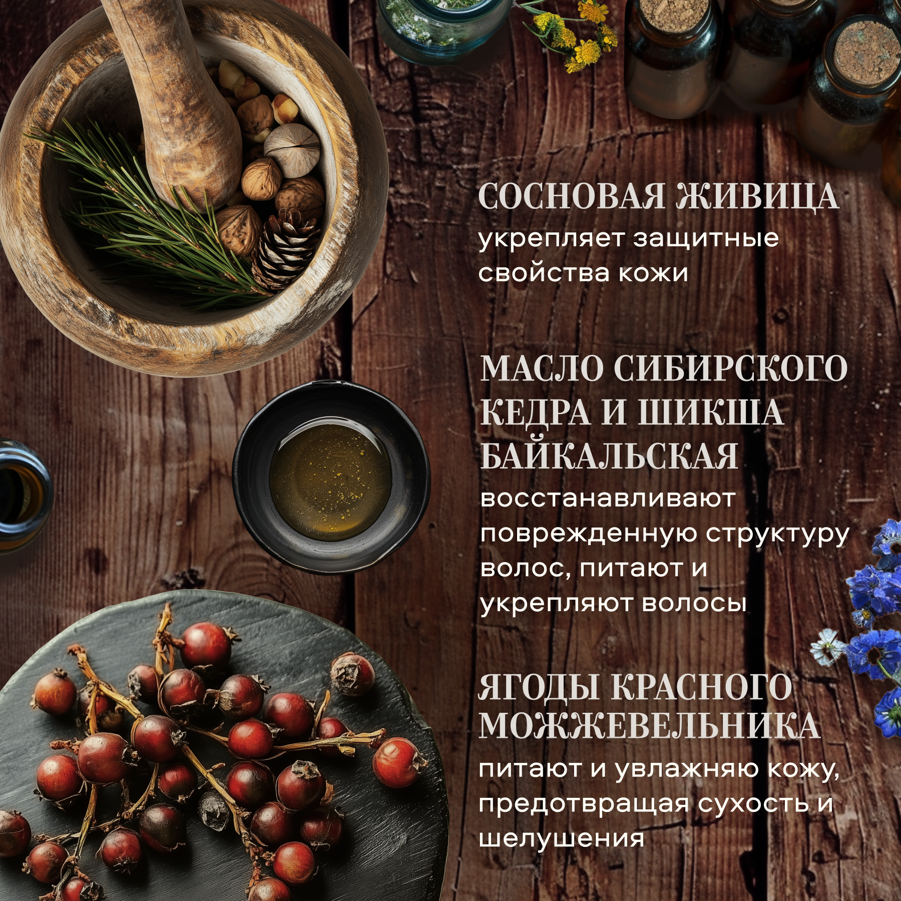 | Состав | Вода, масла: кедровое, даурской сои, пихтовое, пихтовое, облепиховое, можжевеловое, амарантовое, шиповника, репейное, льняное, каменное, алтайский горный воск, деготь, перга, лаурет сульфат натрия, сорбитол, кокамид дэа, настои: шалфея, чистотела, мелиссы, медуницы, ромашки, череды, тысячелистника, крапивы, экстракты: толокнянки, девясила, истода сибирского, сосновой живицы, шишек черной ольхи, золотого корня, дубового мха, уснеи, шикши сибирской, белого и красного мыльного корня, корня алтея, чаги, маралового корня, выжимка лиственницы сибирской, корень солодки, Kathon CG. |