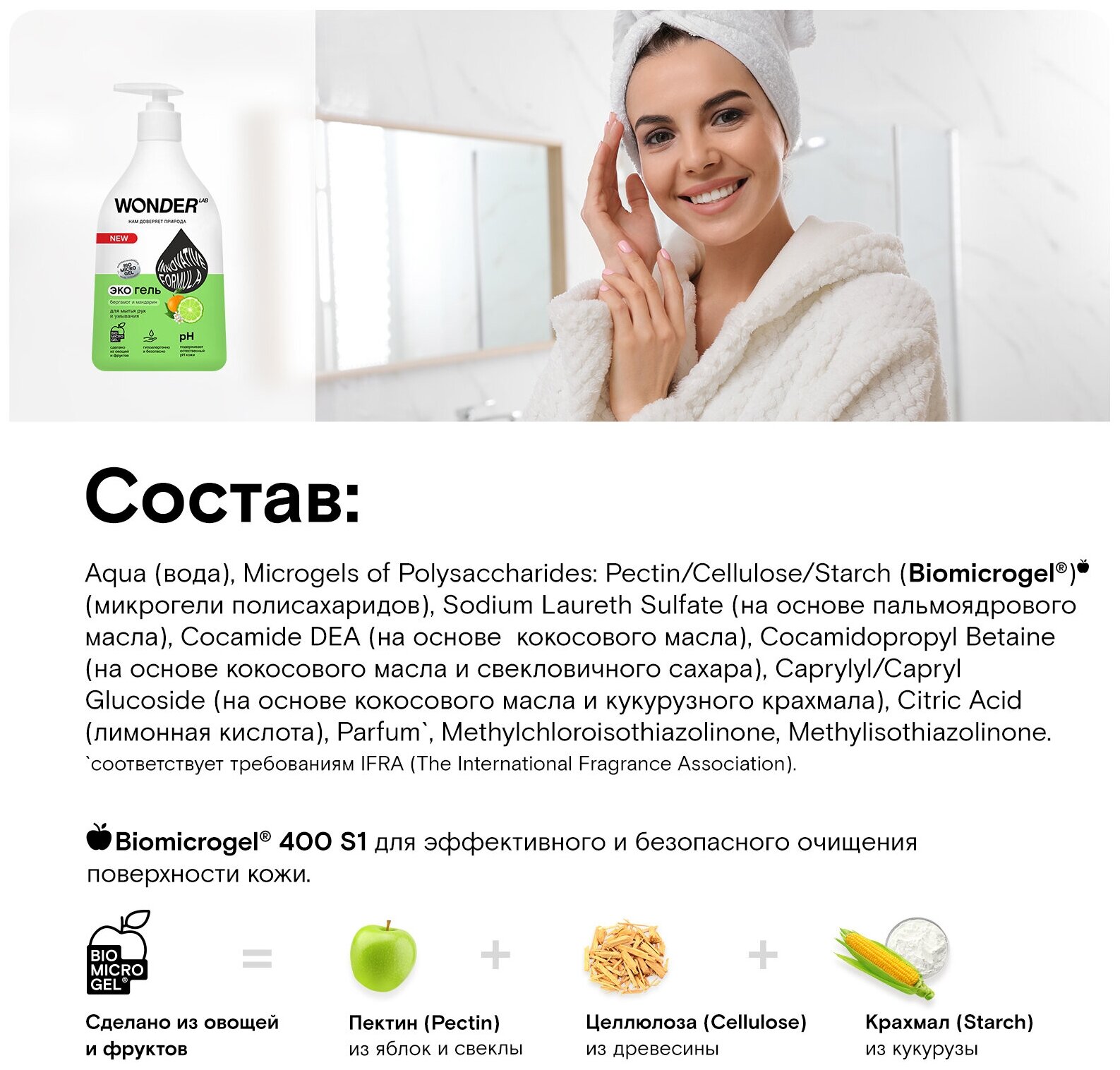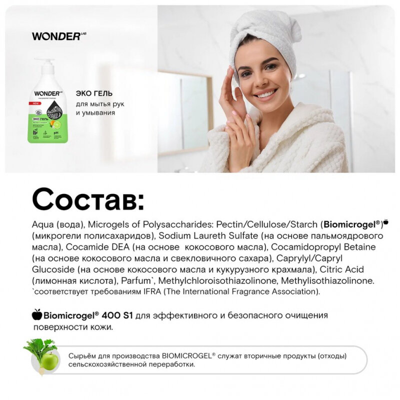 | Состав | Aqua (вода), Microgels of Polysaccharides: Pectin/Cellulose/Starch (Biomicrogel ) (микрогели полисахаридов), Sodium Laureth Sulfate (на основе пальмоядрового масла), Cocamide DEA (на основе кокосового масла), Cocamidopropyl Betaine (на основе кокосового масла и свекловичного сахара), Caprylyl/Capryl Glucoside (на основе кокосового масла и кукурузного крахмала), Citric Acid (лимонная кислота), Parfum', Methylchloroisothiazolinone, Methylisothiazolinone. `соответствует требованиям IFRA (The International Fragrance Association). |