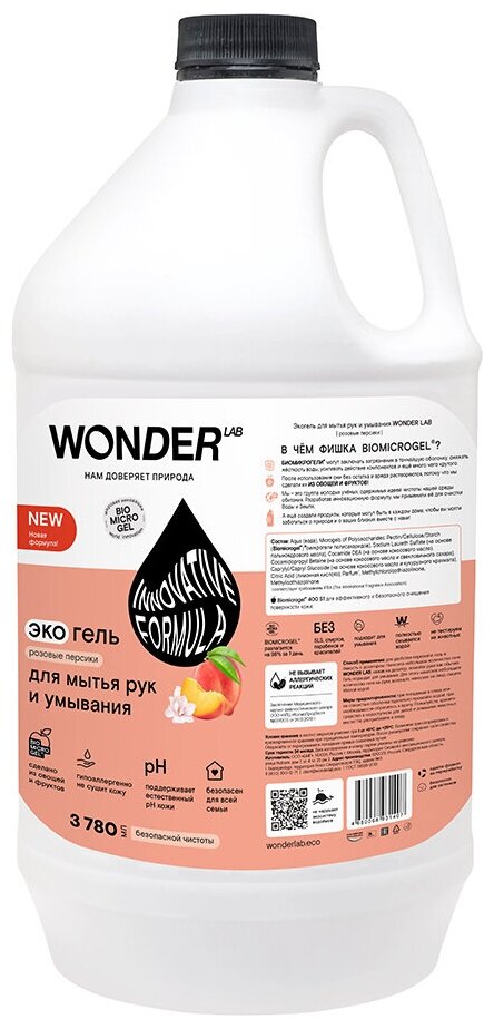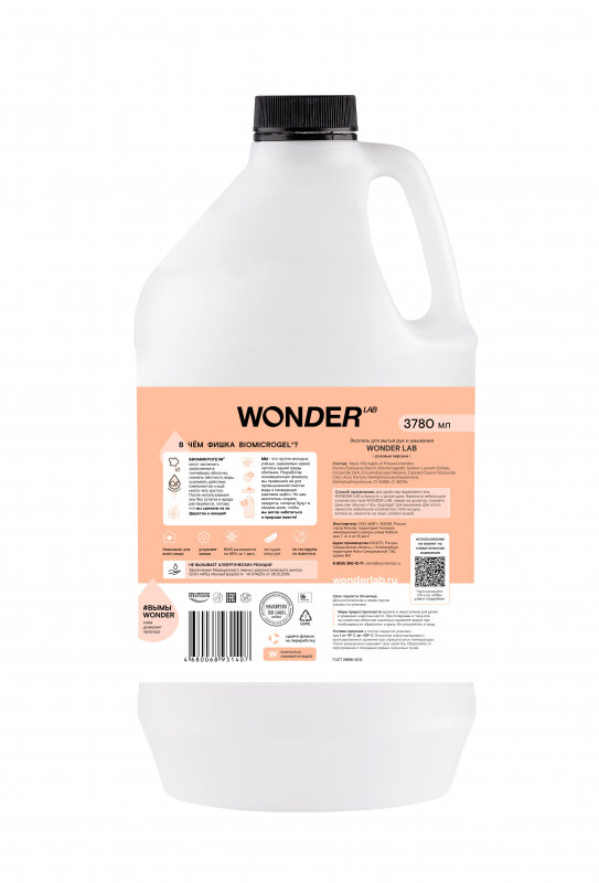 Купить Жидкое эко мыло для рук и умывания WONDER LAB, гель с ароматом розовых персиков, 3780 мл