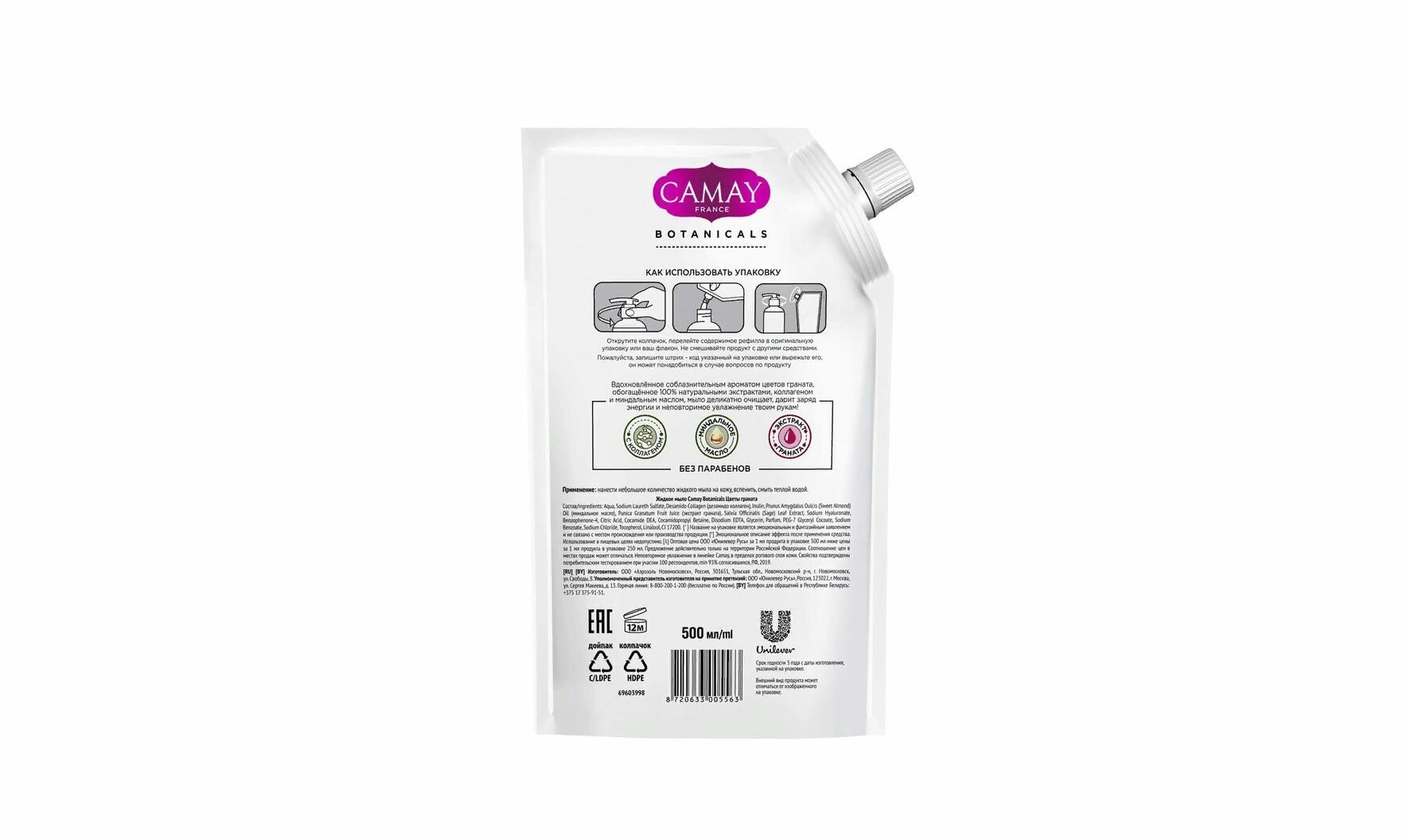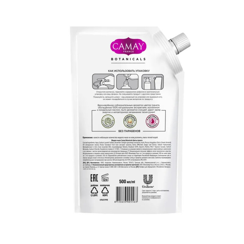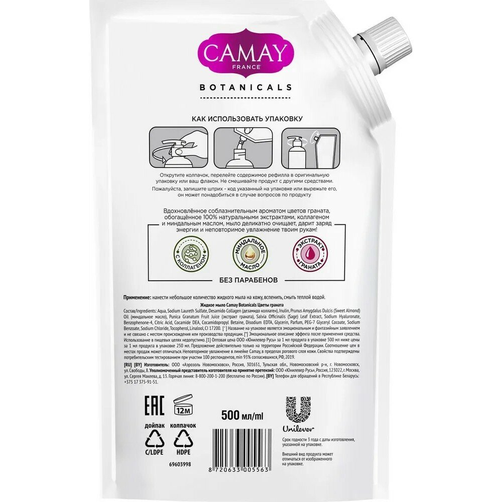 Жидкое мыло Camay BOTANICALS Цветы граната, 500 мл (дой-пак)