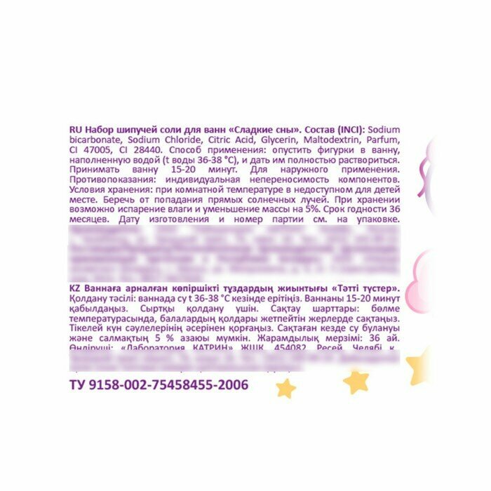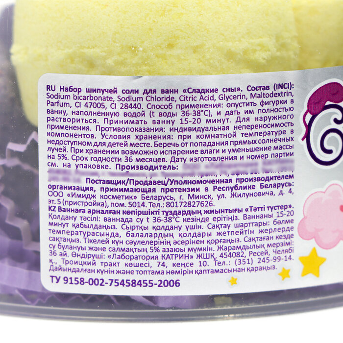 | Способ применения | Наполните ванну теплой водой и равномерно растворите бомбочку. Принимайте ванну 15-20 минут. В гигиенических целях и во избегание окрашивания поверхности ванны рекомендуется почистить поверхность перед процедурой. Для наружного применения. |
