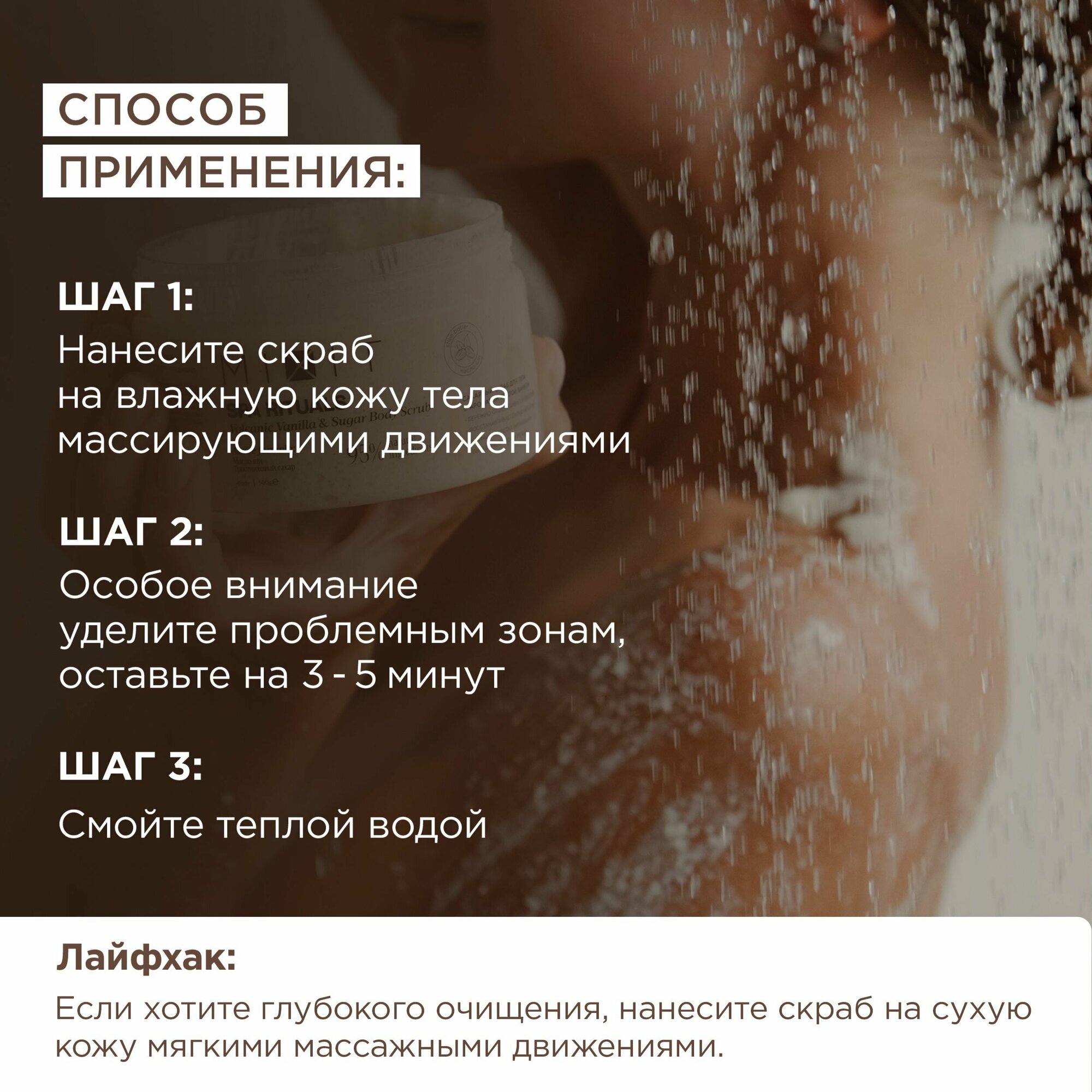 | Способ применения | Взять небольшое количество скраба, равномерно распределить по влажной коже легкими массажными движениями, смыть водой. Использовать 2-3 раза в неделю. |