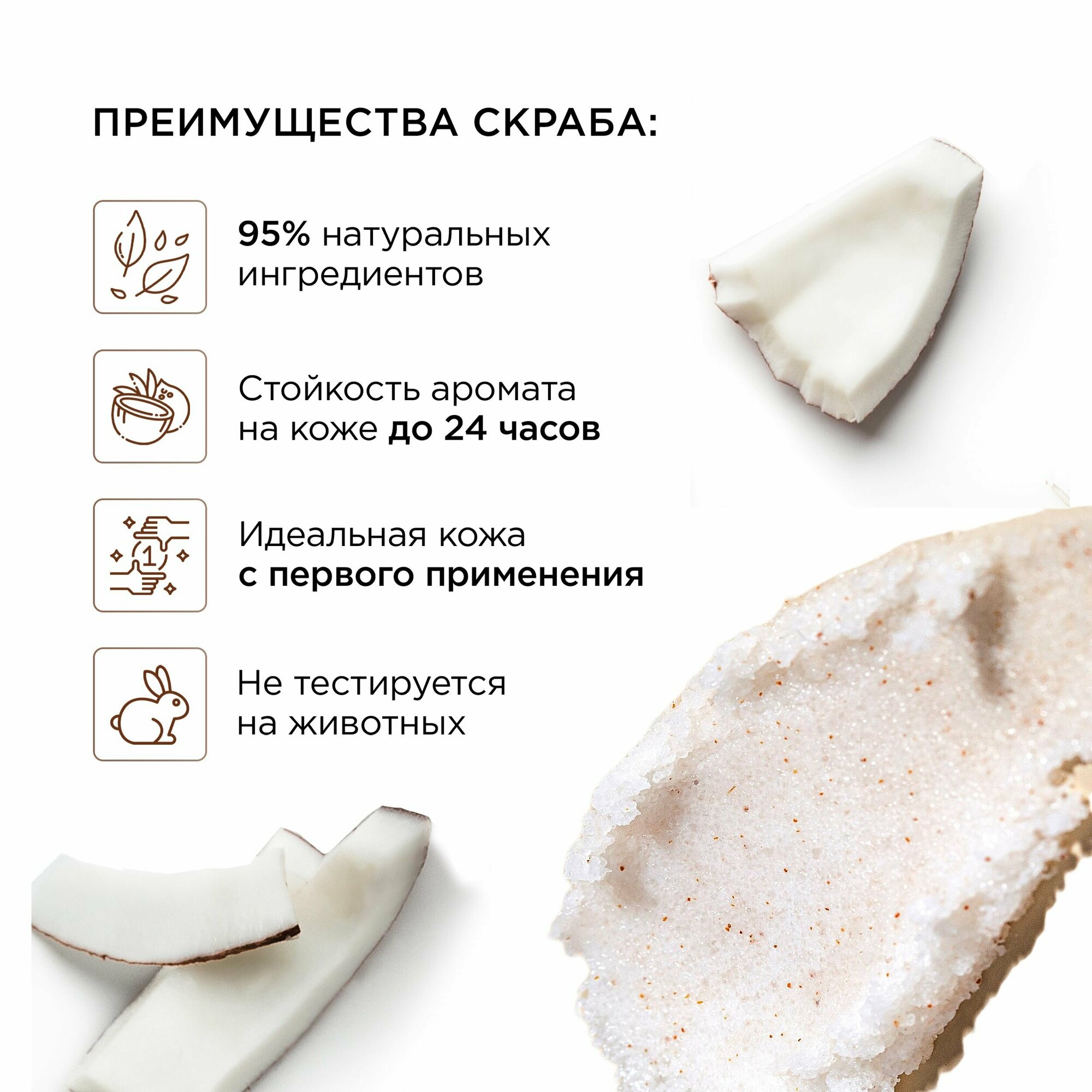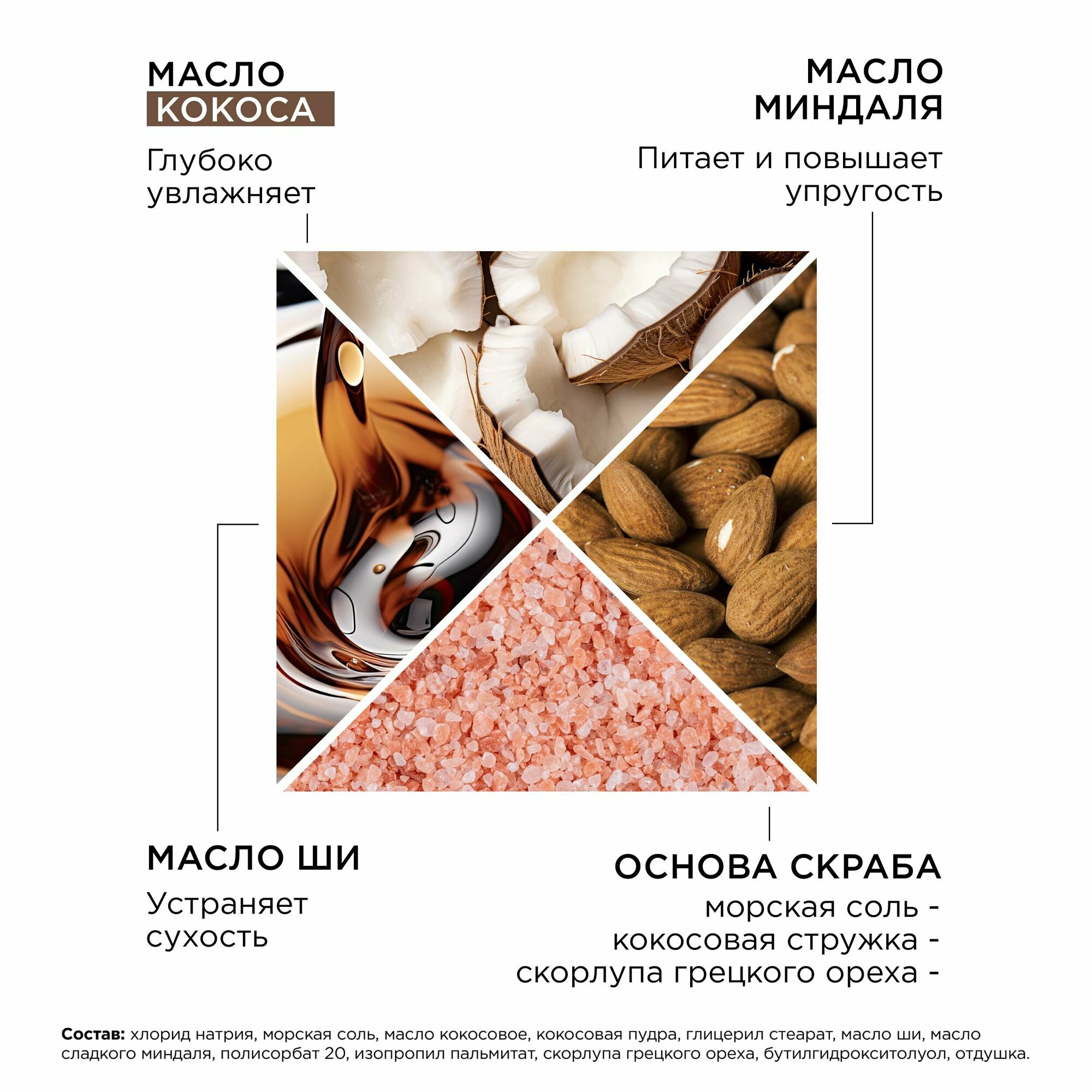 | Отшелушивающее вещество | кокос / сахар / соль / частицы орехов и семян |