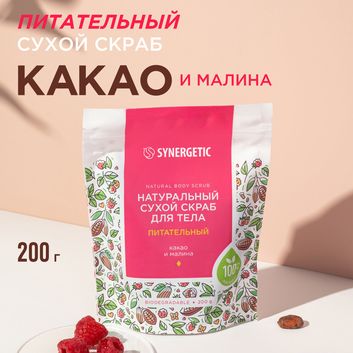 Сухой скраб для тела synergetic питательный какао и малина 200 г