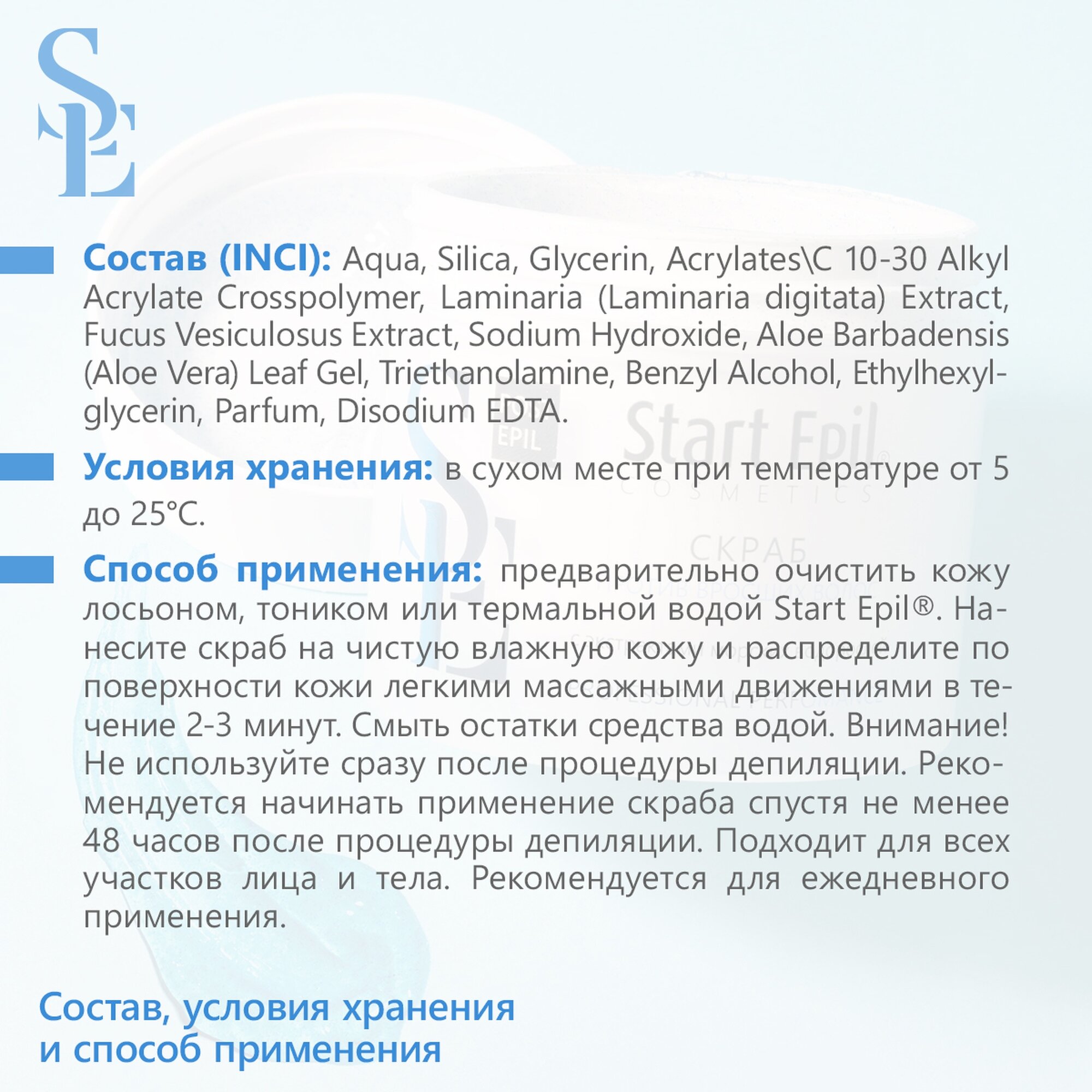 | Способ применения | Предварительно очистить кожу лосьоном, тоником или термальной водой Start Epil®. Нанесите скраб на чистую влажную кожу и распределите по поверхности кожи легкими массажными движениями в течение 2-3 минут. Смыть остатки средства водой. Внимание! Не используйте сразу после процедуры депиляции. Рекомендуется начинать применение скраба спустя не менее 48 часов после процедуры депиляции. Подходит для всех участков лица и тела. Рекомендуется для ежедневного применения. |