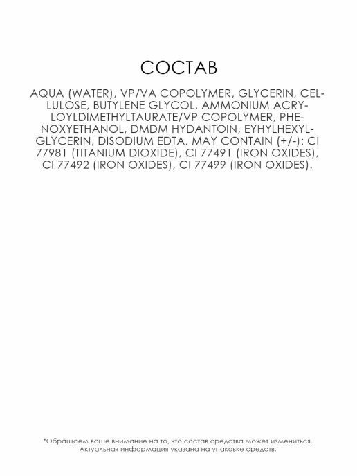 | Состав | Aqua (Water), Ricinus Communis Seed Oil, Glyceryl Stearate, Copernicia Cerifera Cera, Cera Microcristallina, Stearic Acid, Propylene Glycol, Polybutene, Polyamide-8, Magnesium Aluminum Silicate, Stearyl Dimethicone, Hydrolyzed Silk, Triethanolamine, Phenoxyethanol, Caprylyl Glycol, Panthenol, Hydroxyethylcellulose, DMDM Hydantoin, Chlorphenesin, EDTA May Contain (+/-): CI 77891, CI 77491, CI 77492, CI 77499. |