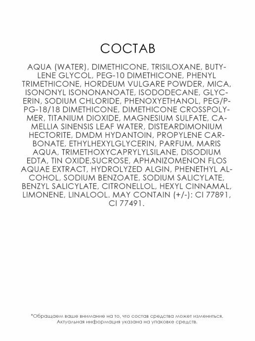 | Состав | aqua (water), dimethicone, trisiloxane, butylene glycol, peg-10 dimethicone, phenyl trimethicone, hordeum vulgare powder, mica, isononyl isononanoate, isododecane, glycerin, sodium chloride, phenoxyethanol, peg/ppg-18/18 dimethicone, dimethicone crosspolymer, titanium dioxide, magnesium sulfate, camellia sinensis leaf water, disteardimonium hectorite, dmdm hydantoin, propylene carbonate, ethylhexylglycerin, parfum, maris aqua, trimethoxycaprylylsilane, disodium edta, tin oxide,sucrose, aphanizomenon flos aquae extract, hydrolyzed algin, phenethyl alcohol, sodium benzoate, sodium salicylate, benzyl salicylate, citronellol, hexyl cinnamal, limonene, linalool. may contain (+/-): ci 77891, ci 77491 |