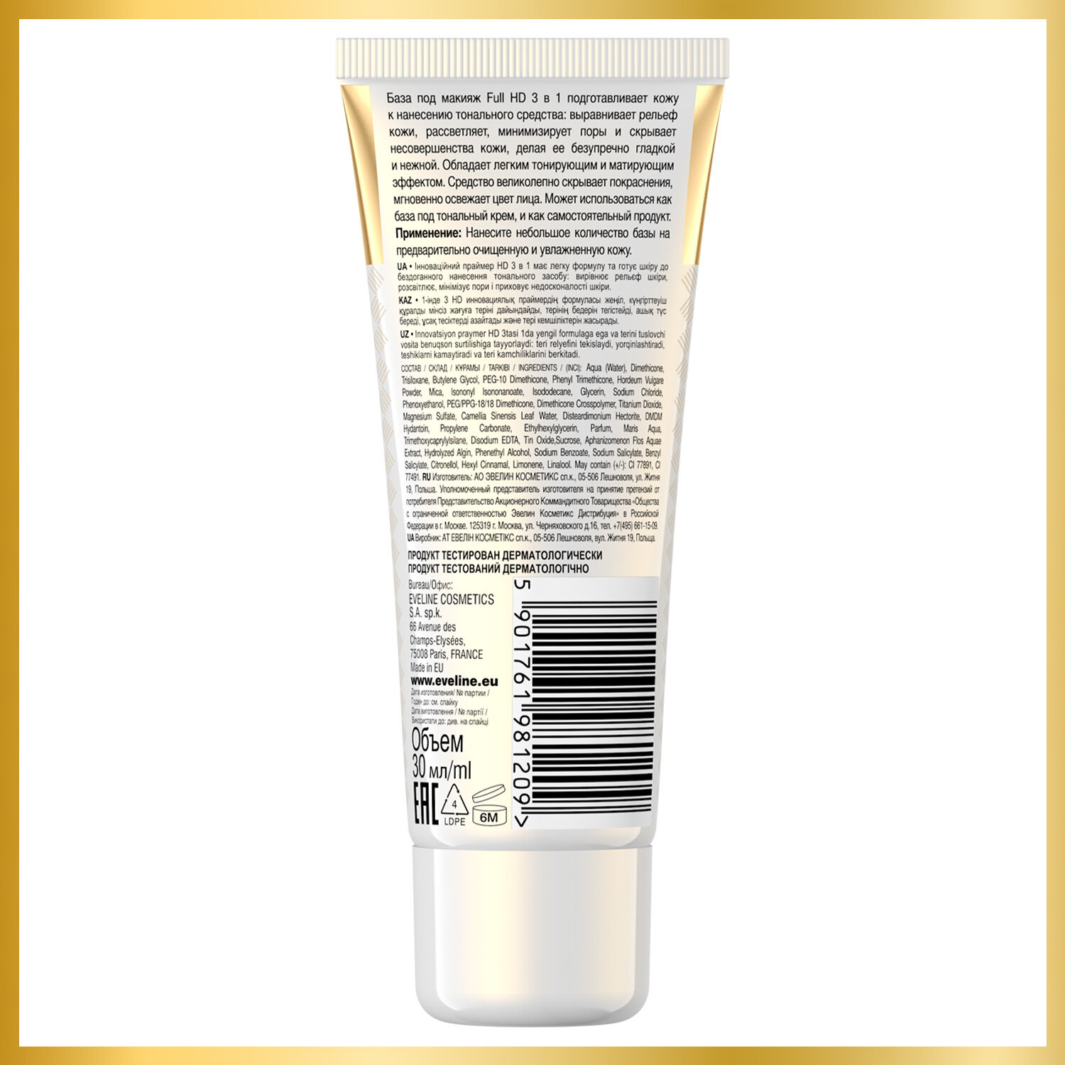 EVELINE База под макияж BASE FULL HD выравнивающе-матирующая 3в1, 30 мл