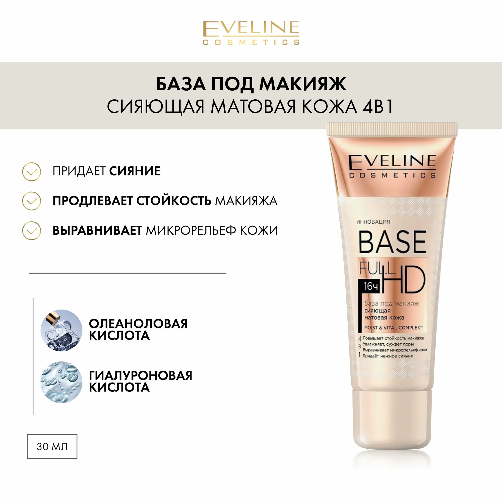 EVELINE База под макияж BASE FULL HD cияющая матовая кожа 4в1, 30 мл