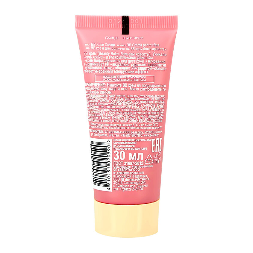 | Дополнительная информация | BB крем имеет натуральный естественный оттенок, подстраивается под цвет кожи, мгновенно выравнивает тон, визуально скрывает недостатки кожи и увлажняет ее, обладает УФ защитой, обеспечивает умеренный тонирующий эффект. Экстракт австралийских ягод наполняет кожу витаминами и минералами. ПОДХОДИТ ДЛЯ ВСЕХ ТИПОВ КОЖИ. |