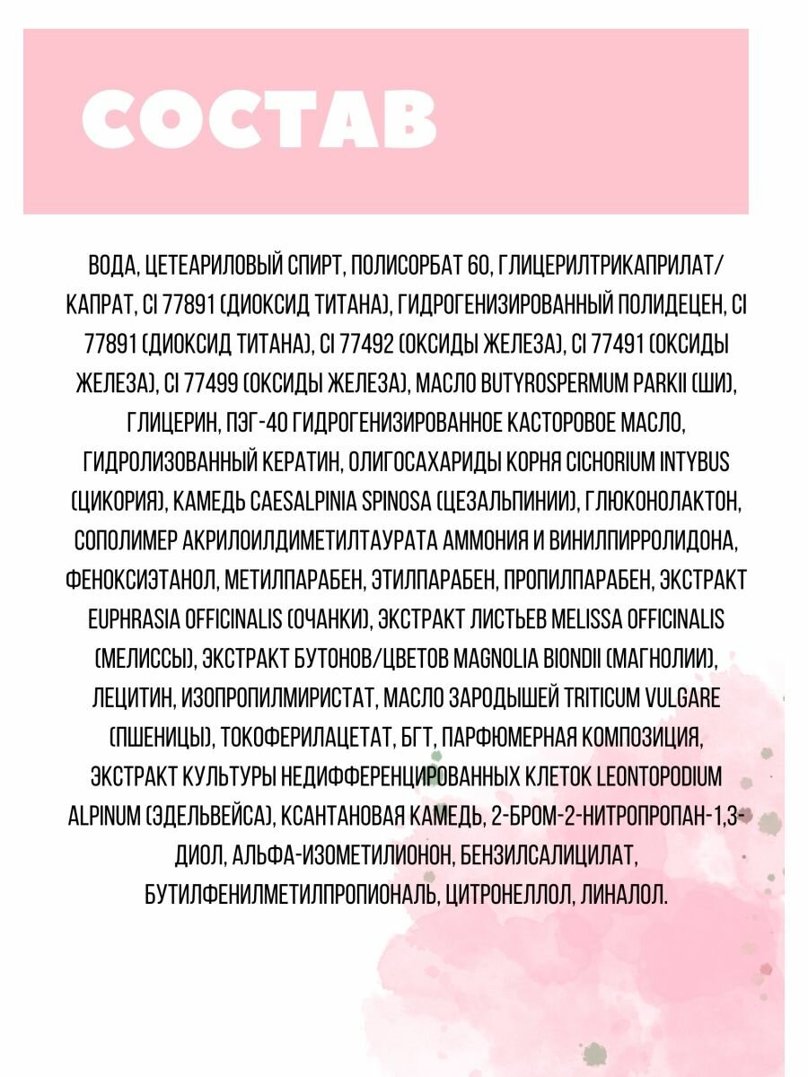 | Эффект | выравнивание поверхности кожи / защита от солнца / лифтинг / маскировка несовершенств / омоложение / питание / разглаживание морщин / тонирование / увлажнение / улучшение цвета |