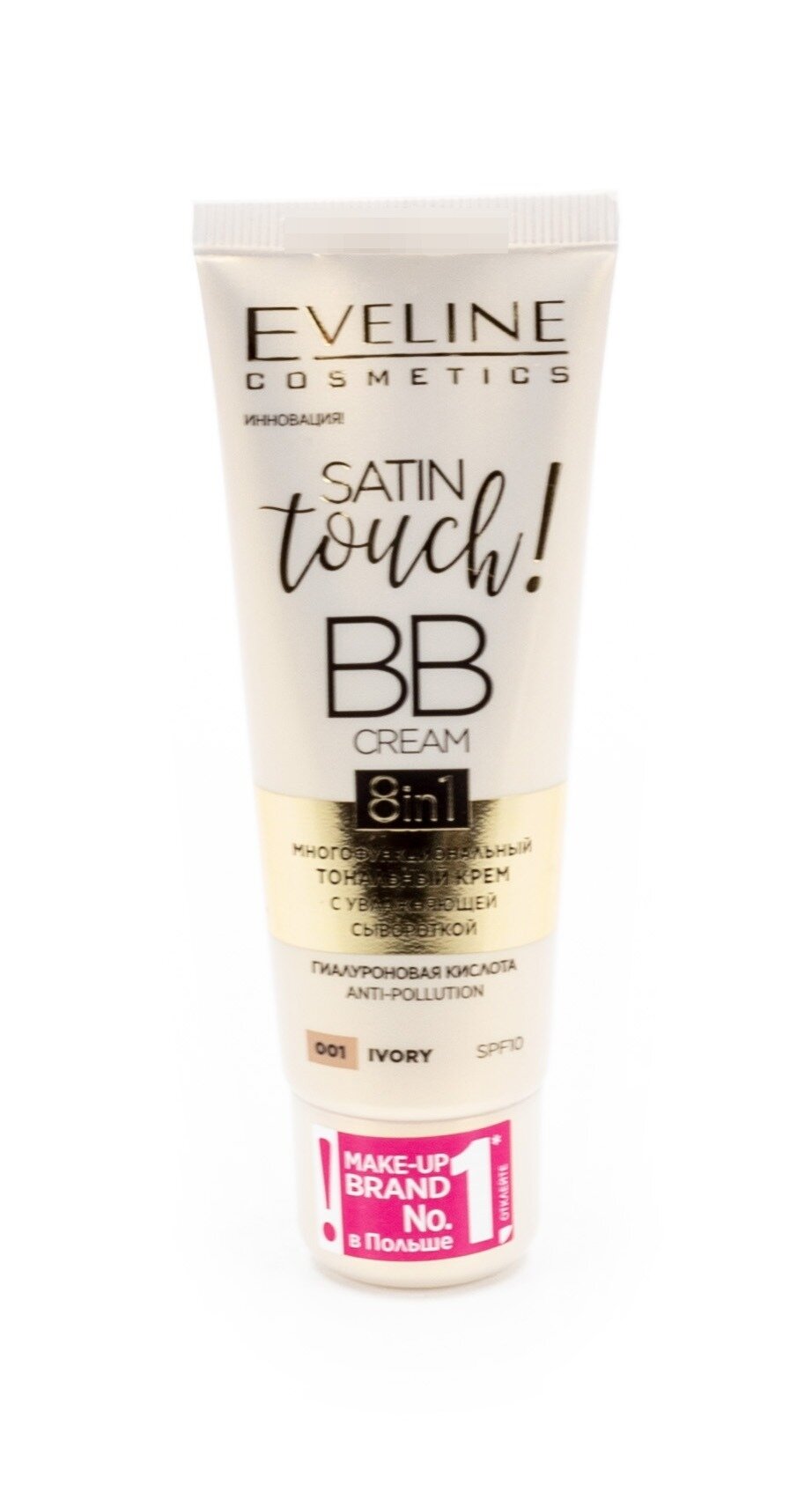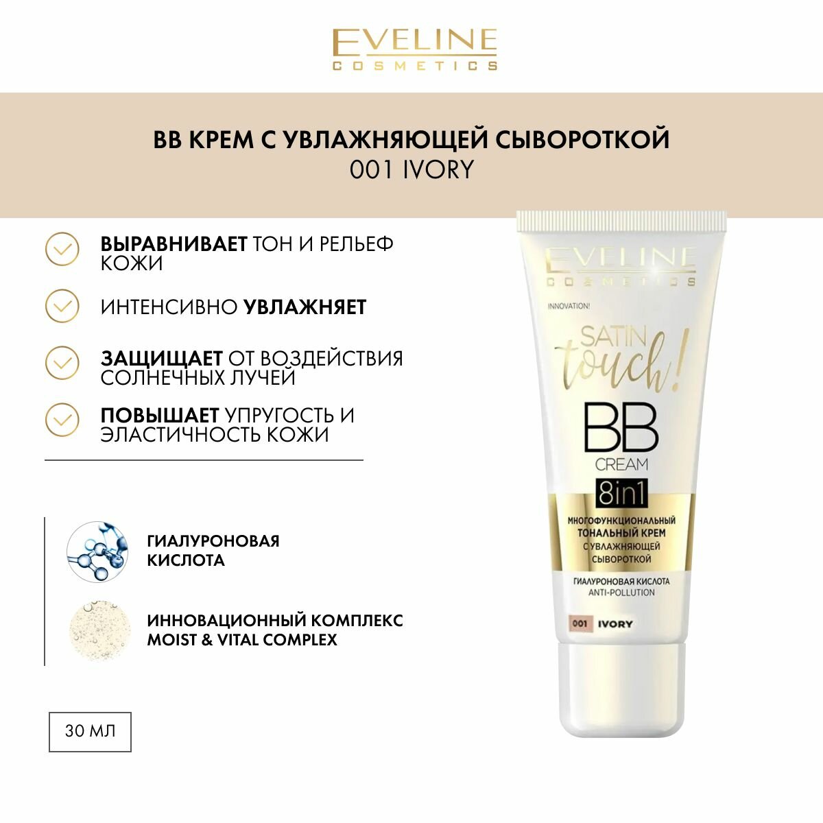 BB-крем для лица 8в1 EVELINE SATIN TOUCH с увлажняющей сывороткой №001 - IVORY, 30 мл