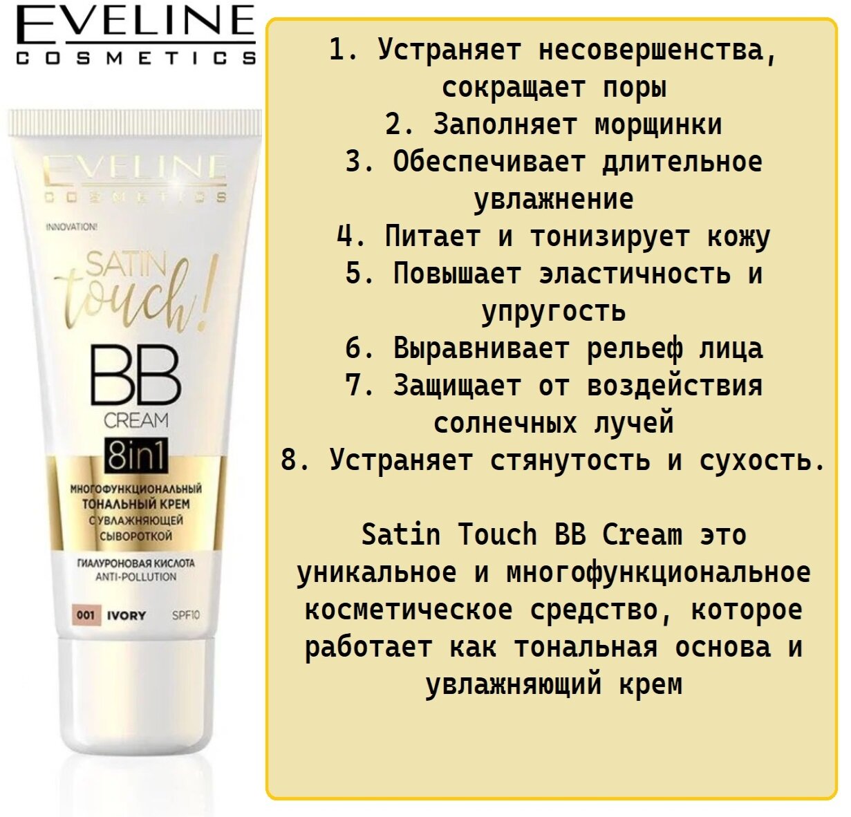 BB-крем для лица 8в1 EVELINE SATIN TOUCH с увлажняющей сывороткой №001 - IVORY, 30 мл