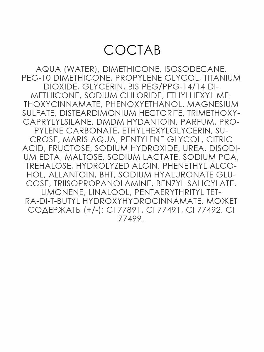| Состав | Aqua (Water), Dimethicone, Isosodecane, PEG-10 Dimethicone, Propylene Glycol, Titanium Dioxide, Glycerin, Bis PEG/PPG-14/14 Dimethicone, Sodium Chloride, Ethylhexyl Methoxycinnamate, Phenoxyethanol, Magnesium Sulfate, Disteardimonium Hectorite, Trimethoxycaprylylsilane, DMDM Hydantoin, Parfum, Propylene Carbonate, Ethylhexylglycerin, Sucrose, Maris Aqua, Pentylene Glycol, Citric Acid, Fructose, Sodium Hydroxide, Urea, Disodium EDTA, Maltose, Sodium Lactate, Sodium PCA, Trehalose, Hydrolyzed Algin, Phenethyl Alcohol, Allantoin, BHT, Sodium Hyaluronate Glucose, Triisopropanolamine, Benzyl Salicylate, Limonene, Linalool, Pentaerythrityl Tetra-di-t-butyl Hydroxyhydrocinnamate. Может содержать (+/-): CI 77891, CI 77491, CI 77492, CI 77499 |