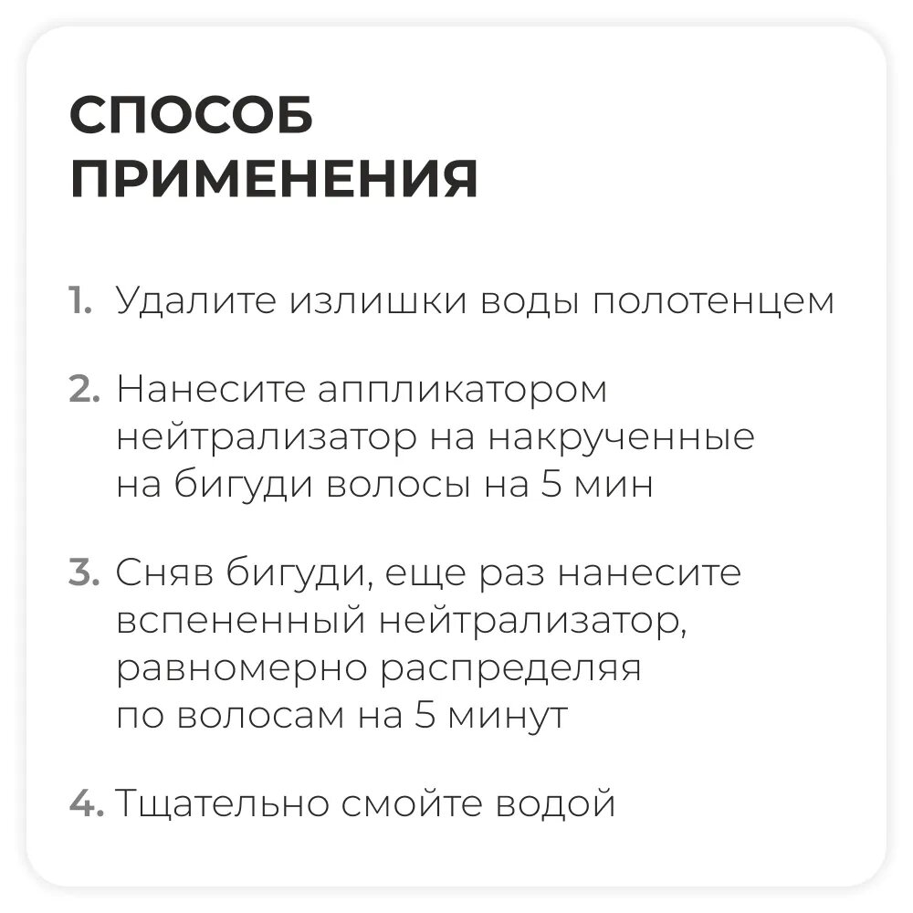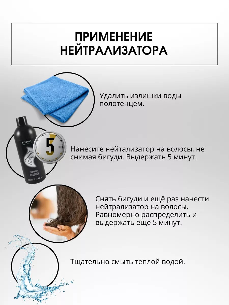 | Способ применения | удалить излишки воды полотенцем; нейтрализатор нанести аппликатором на накрученные на бигуди волосы на 5 мин.; сняв бигуди, еще раз нанести вспененный нейтрализатор, равномерно распределяя по волосам, выдержать еще 5 мин., затем тщательно промыть водой |