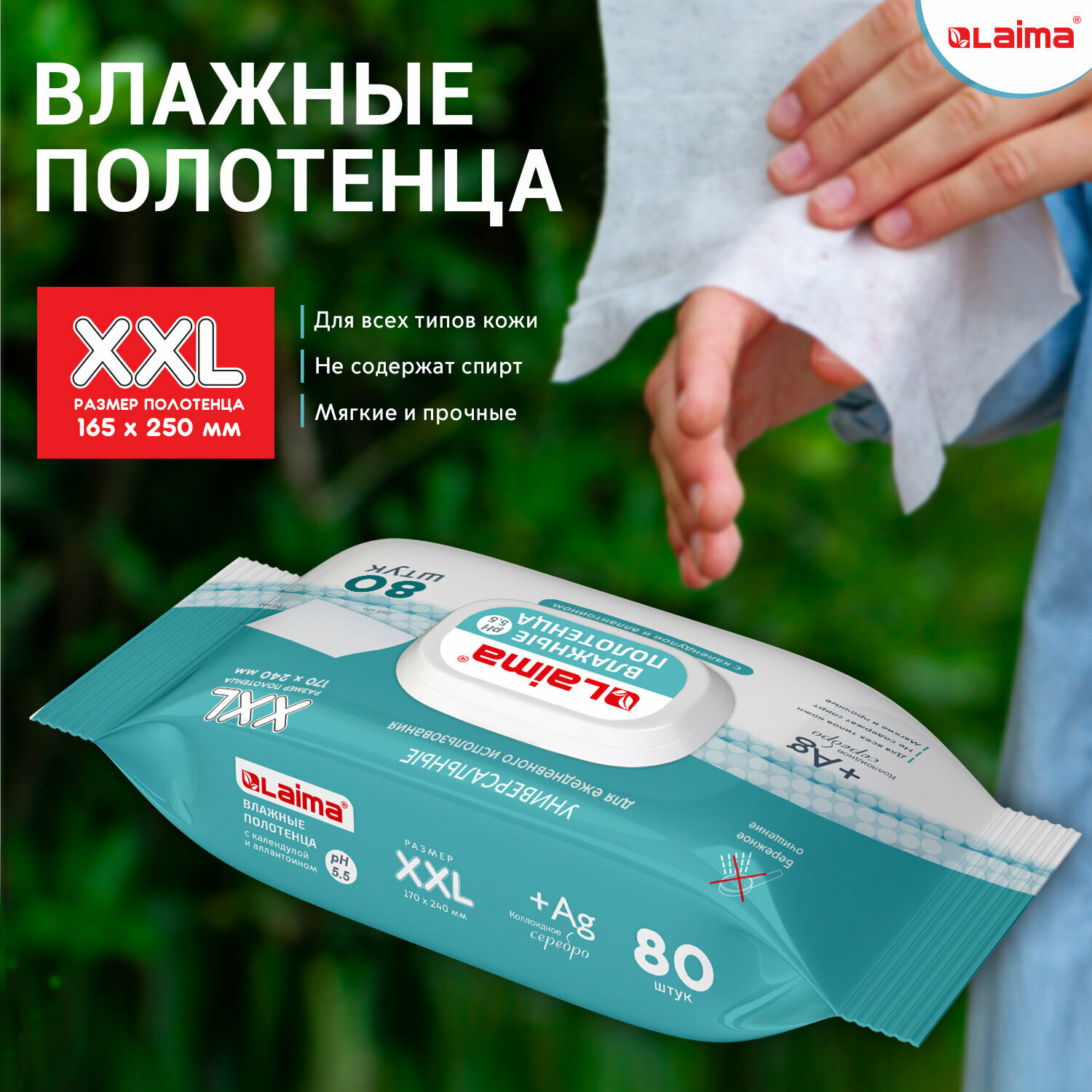 Влажные полотенца LAIMA большие XXL, 16.5x25 см, с аллантоином и коллоидным серебром, 80 шт. 115222