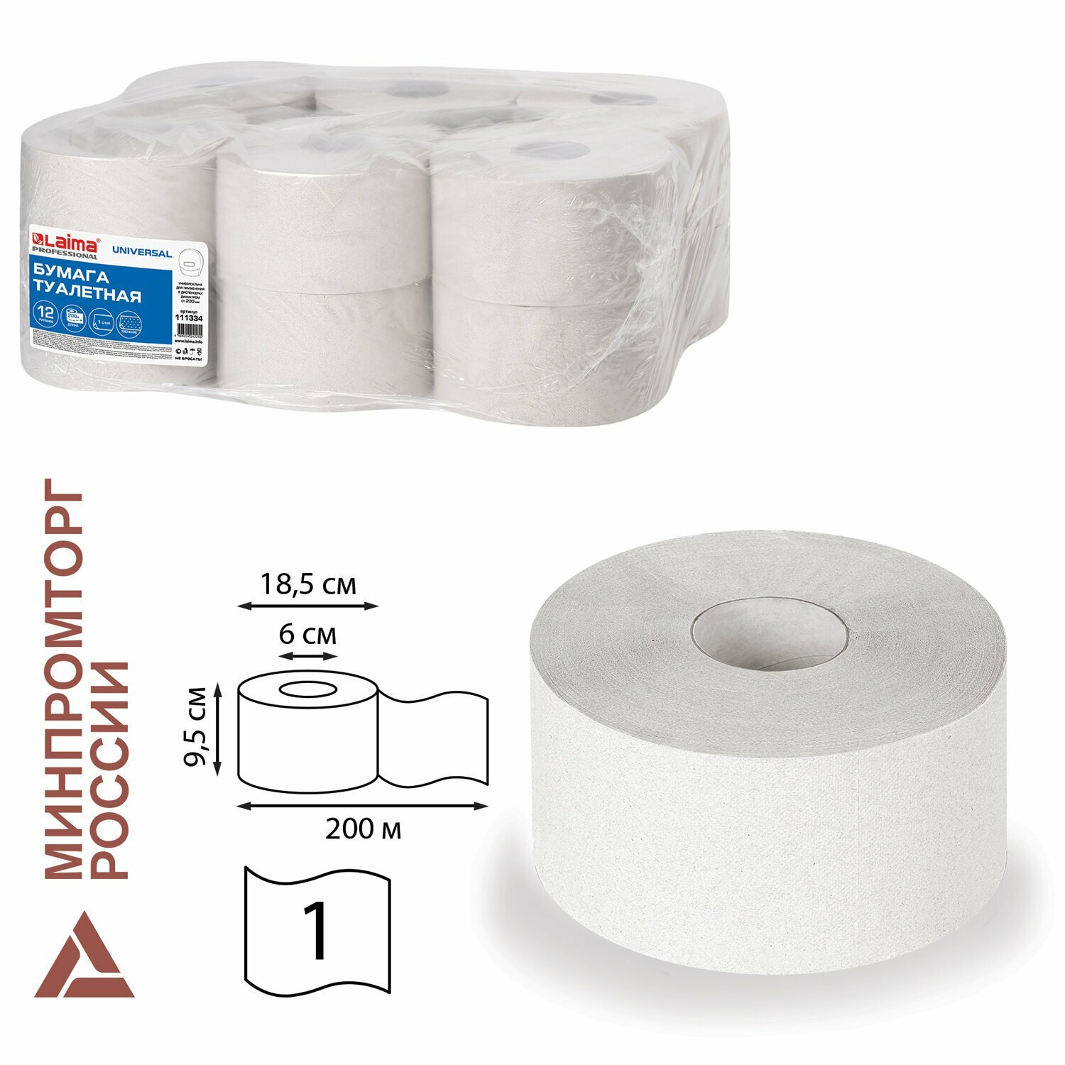 Бумага туалетная 200 м, LAIMA (T2), UNIVERSAL, 1-слойная, цвет натуральный, комплект 12 рулонов, 111334, в наборе 1 компл.