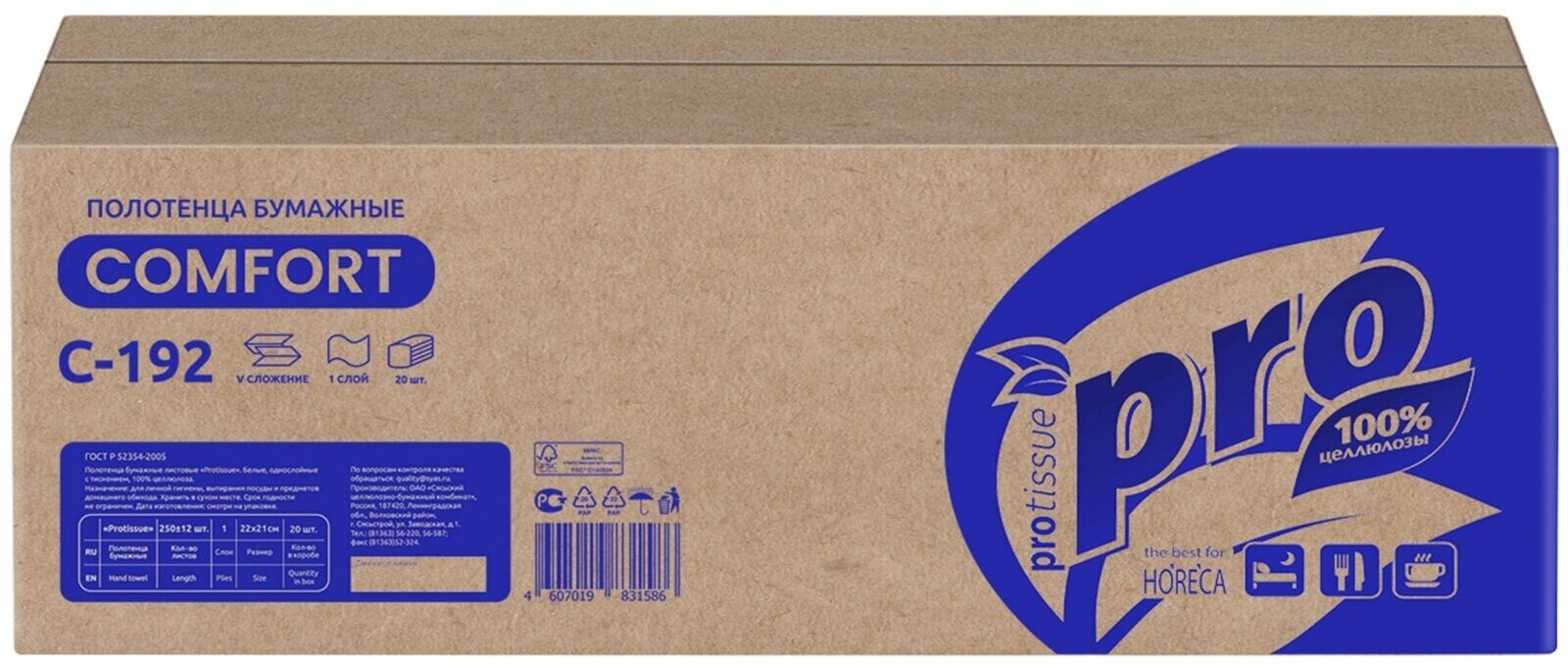Полотенца бумажные листовые PROtissue С192 V, 1 сл., 250 л., 1 пачка, Comfort