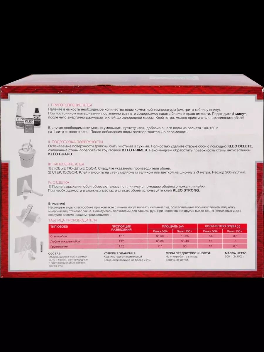 | Дополнительная информация | Клей для тяжелых обоев Kleo Ultra 50 м² |