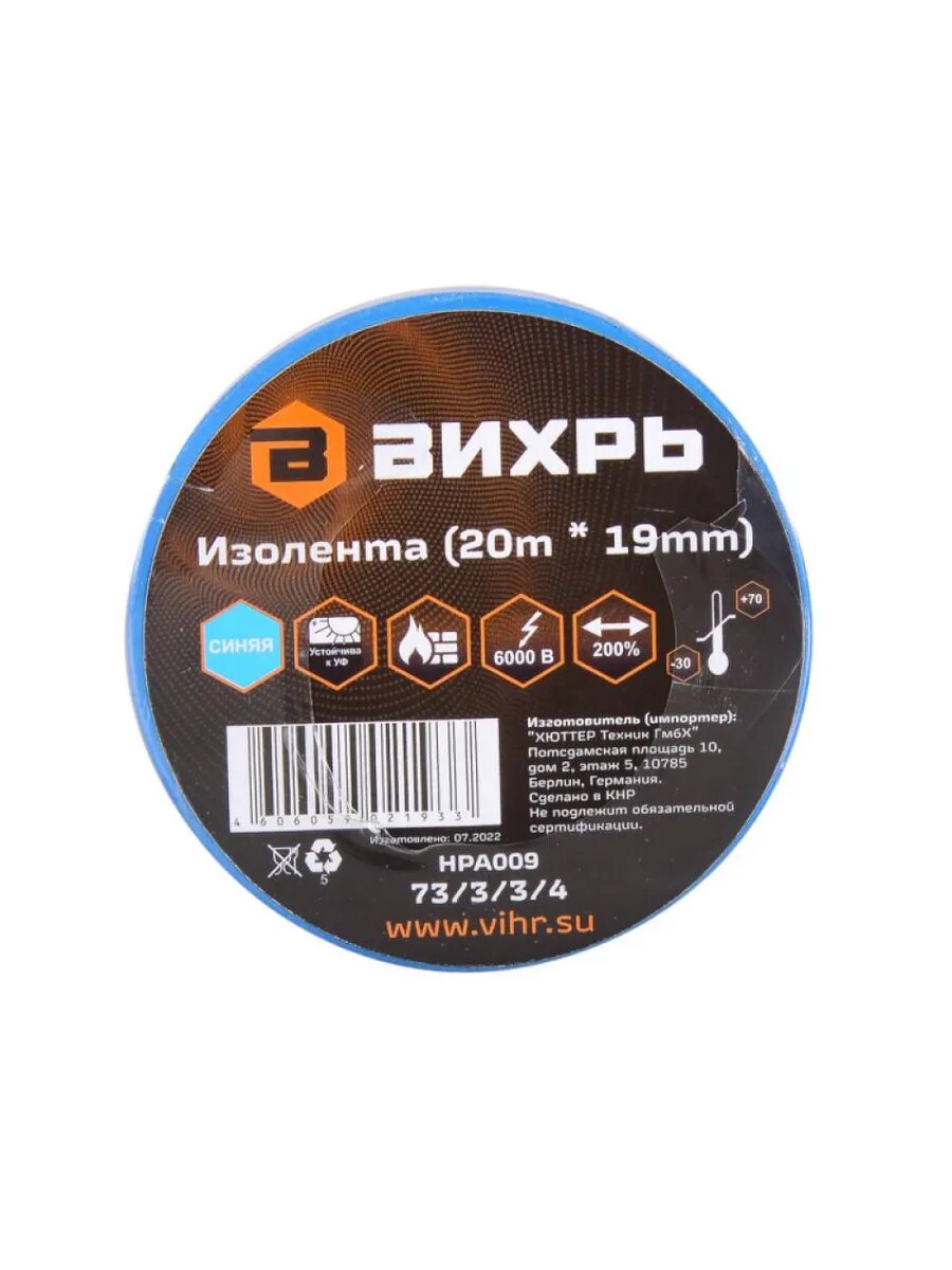 Изолента Вихрь (20m * 19mm) синяя, 73/3/3/4