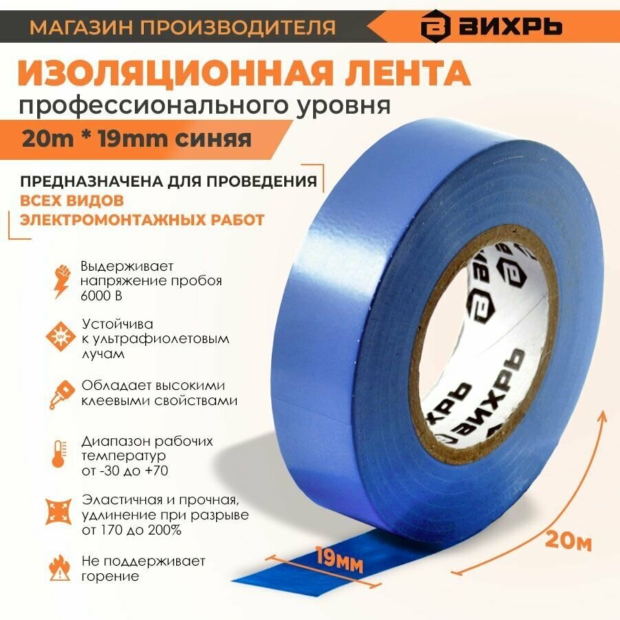 Купить Изолента профессиональная из поливинилхлоридного изоляционного пластика (20m * 19mm) синяя Вихрь